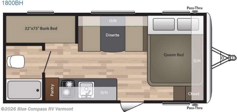 Step inside and notice the front queen bed with full front overhead storage, and a closet at the foot of the bed as the bed is turned width wise with the head of the bed along the road side wall. You will find plenty of storage beneath the queen bed as well.
