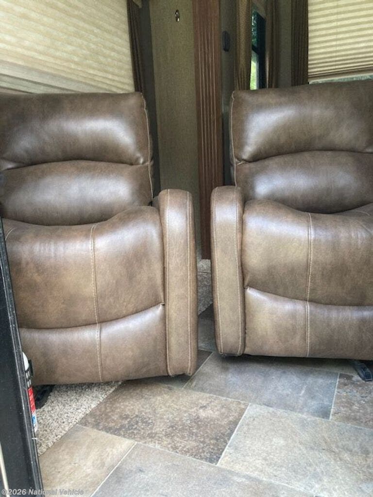 The inviting rear lounge includes two plush swivel rockers and large panoramic windows that let in natural light and scenic views. A slide-out houses the comfortable sofa and booth dinette, both of which convert into extra sleeping space. The entertainment center is perfectly positioned for relaxing evenings, offering a cozy spot to unwind after a day of exploring.