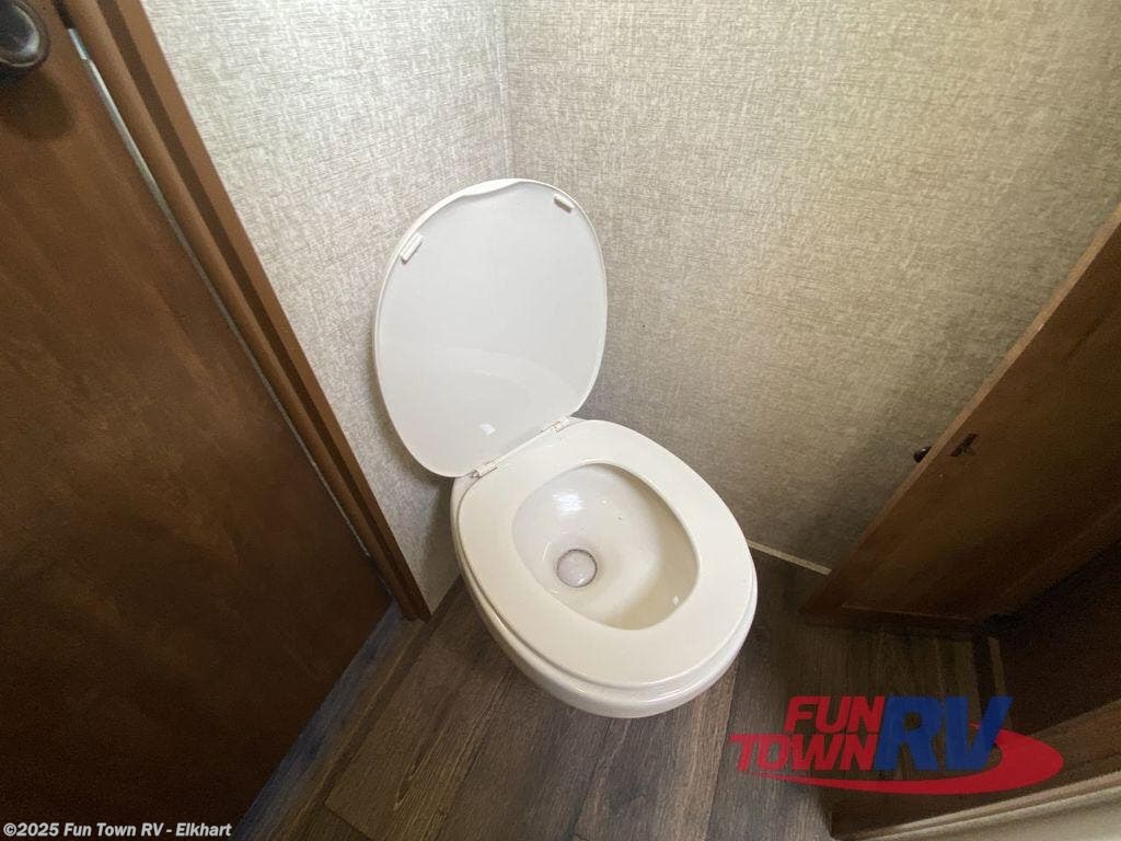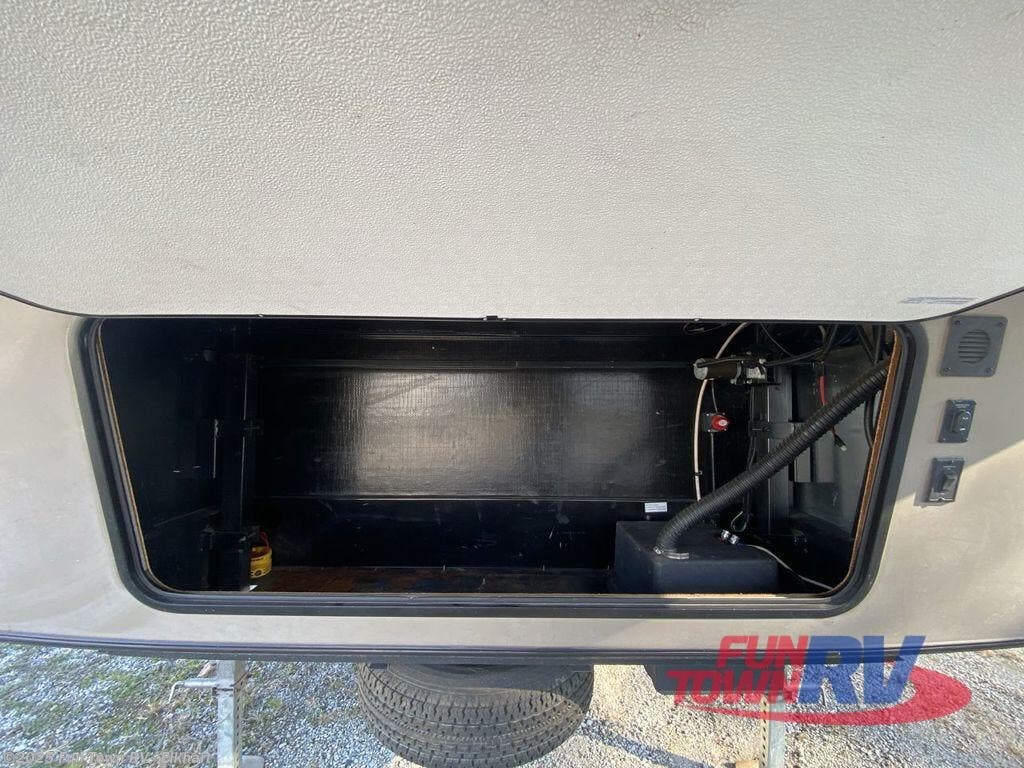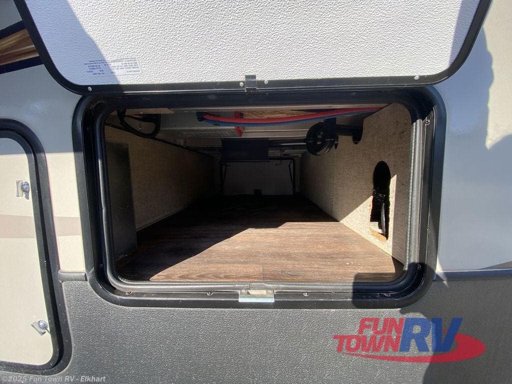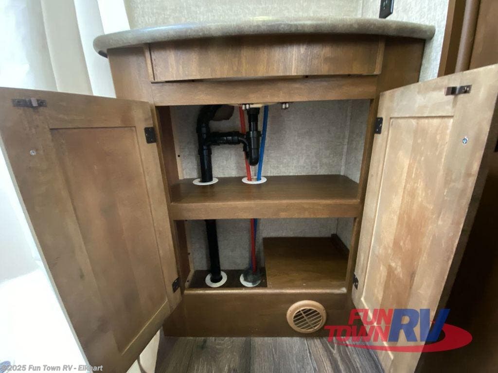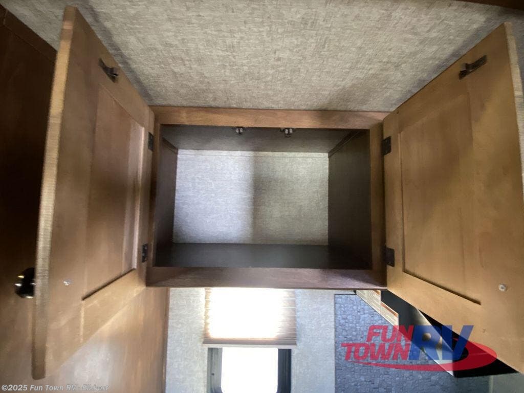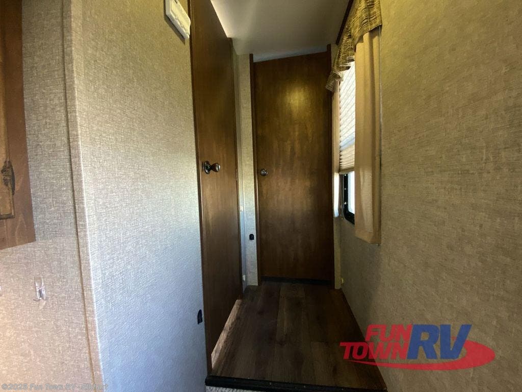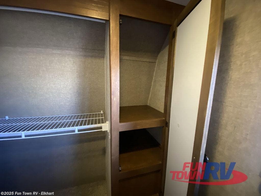 Enter model 298FWRLS and head up the steps on your right to the front master bedroom and side aisle bath. The bathroom offers a residential shower, toilet, sink, and linen cabinet. The private master bedroom at the end of the hall features a slide out residential queen size bed. There is also a dresser opposite, plus a front wall wardrobe and closet for all of your clothing and storage needs.