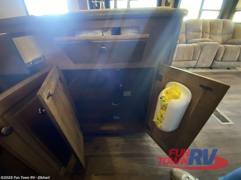 The kitchen provides everything you need to prepare and cook food for your family. There is a large L-shaped counter area with a double sink on the end, overhead cabinets for all of your dishes and things, plus a slide out along the road side that includes a three burner range and 18 cu. ft. residential refrigerator. You will also find more storage space near the entertainment center that is mentioned above, plus so much more!