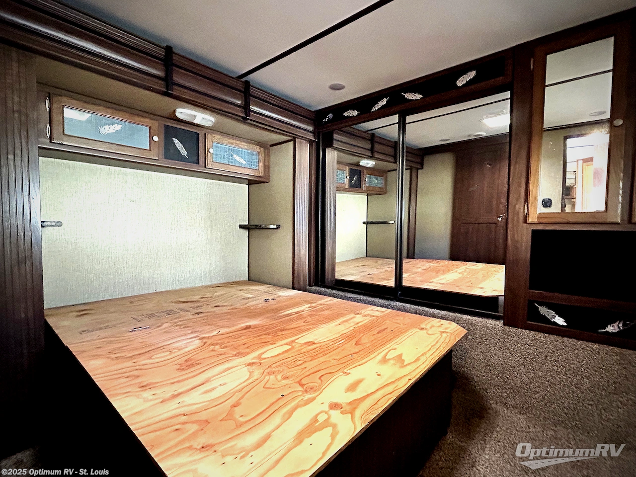 The front bedroom features a residential queen bed slide out, dresser opposite the bed, and a full front wardrobe with sliding doors. There is also a corner closet that has been prepped for a washer and dryer if you choose to add.