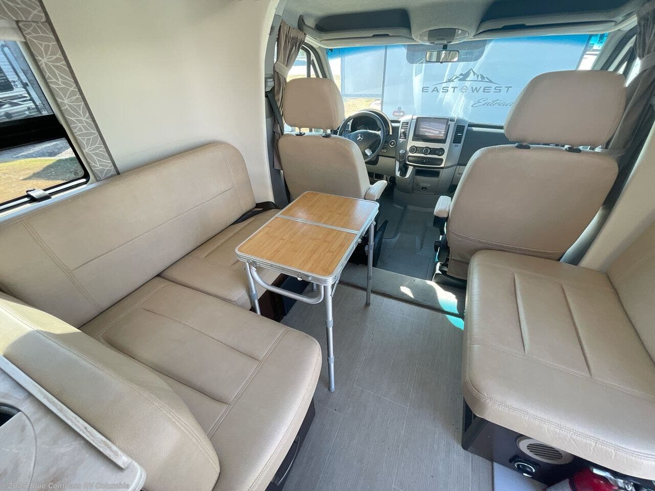 You will enjoy plenty of seating with a belted chair to the right of the door, the passenger and driver seats swivel to the back when parked, and there is an L-shaped bench behind the driver's seat for plenty of space to enjoy meals and conversation with a pedestal table between.