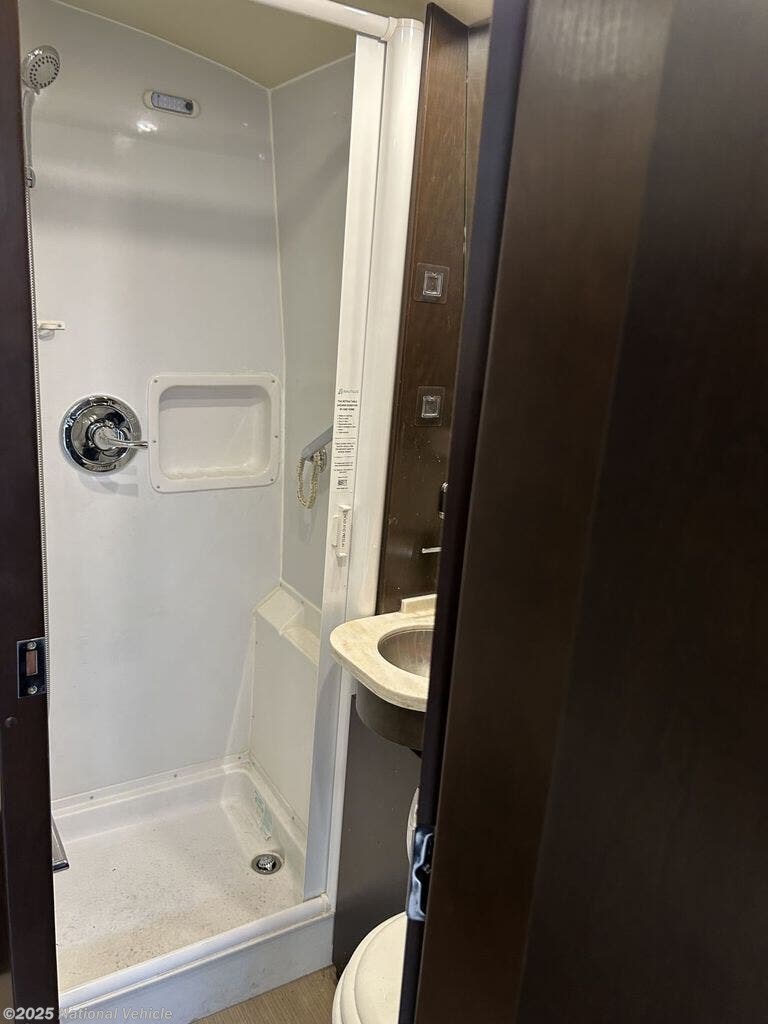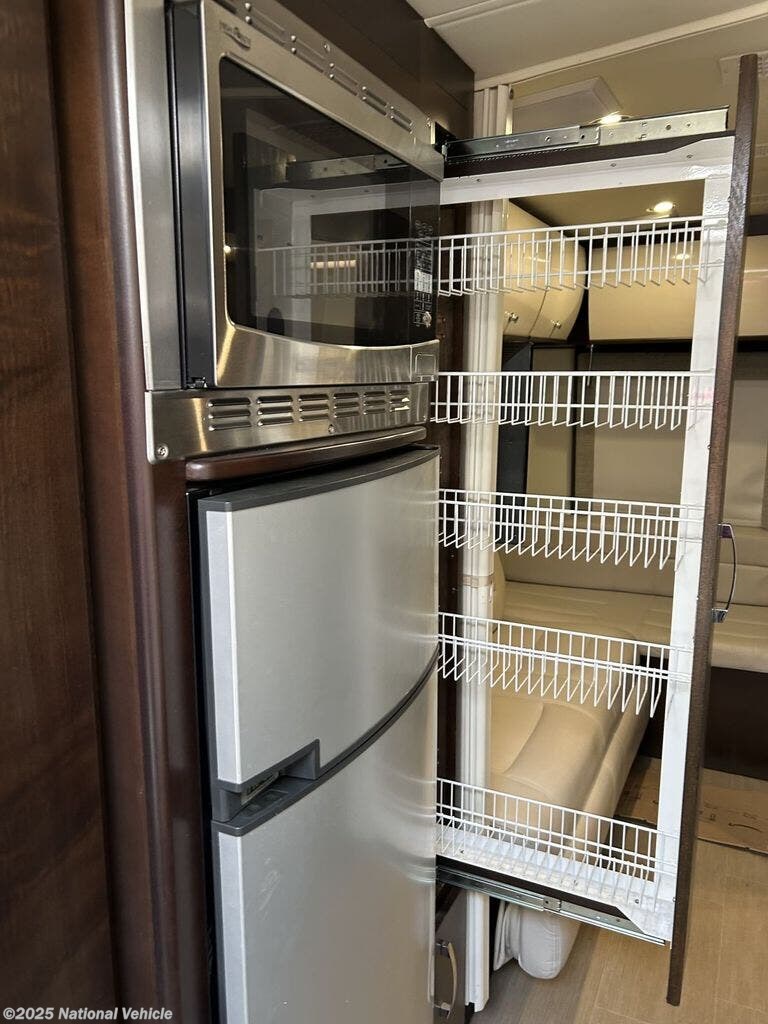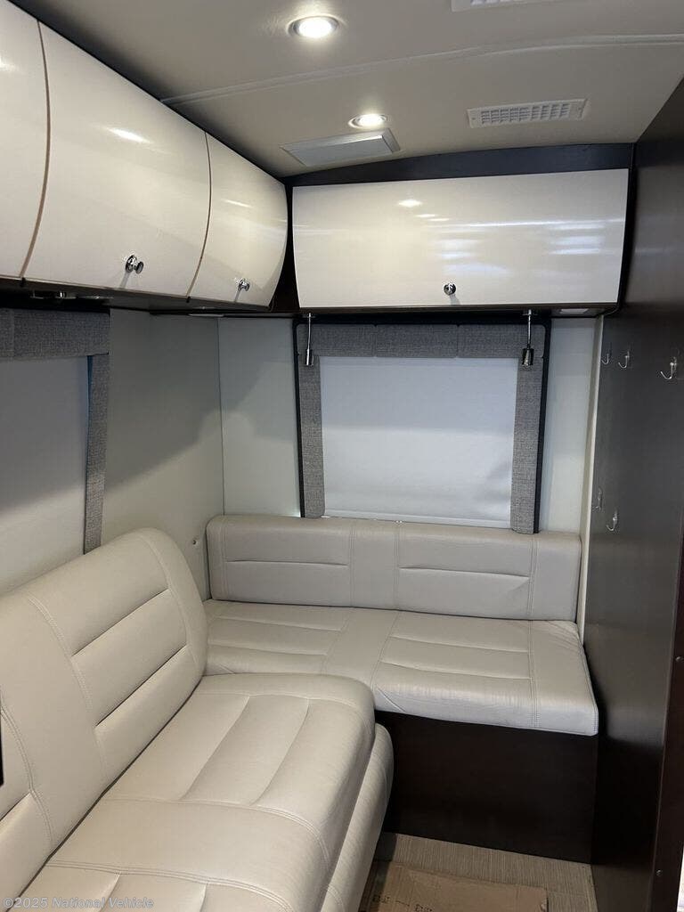 Inside, the S24CB floorplan is thoughtfully laid out to maximize every inch of space, featuring high-end materials, curved cabinetry, and sleek ultra-leather upholstery. The rear corner bed provides a comfortable retreat, while the spacious dry bathroom with a separate shower sets this coach apart in its class. The front living area includes a convertible dinette, swivel cab seats, and a smartly designed galley kitchen complete with a two-burner cooktop, convection microwave, solid-surface countertops, and a large fridge. Abundant storage inside and out ensures you can travel fully equipped without feeling cramped.