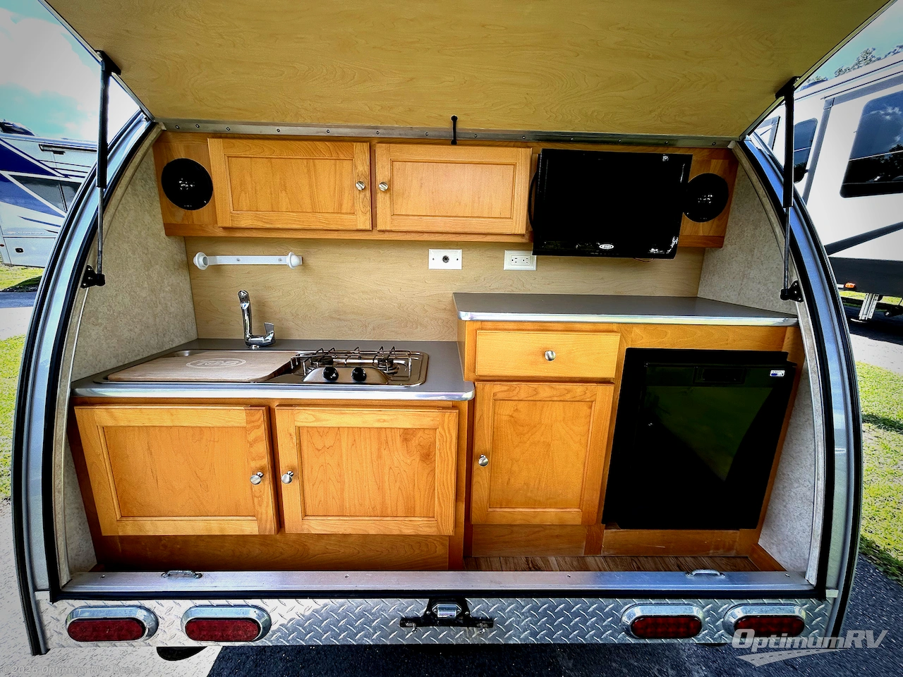 This Little Guy 6' Wide Platform teardrop model features a fiberglass exterior with custom graphics in your choice of design. There is a king size mattress and it can easily be towed by an SUV.