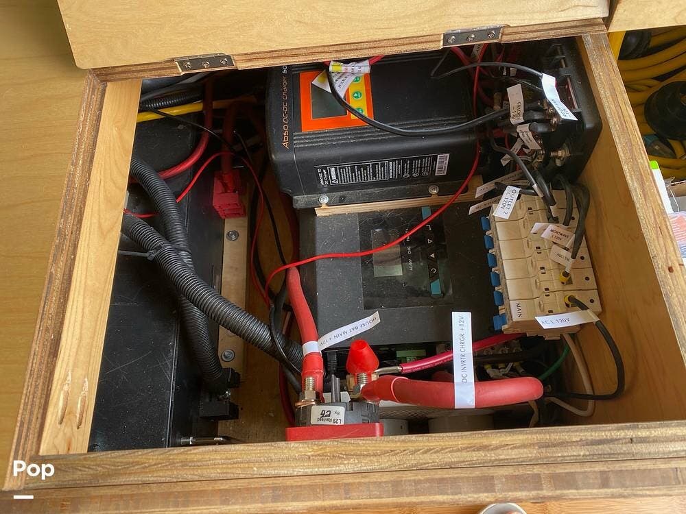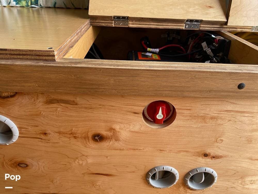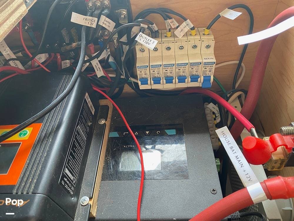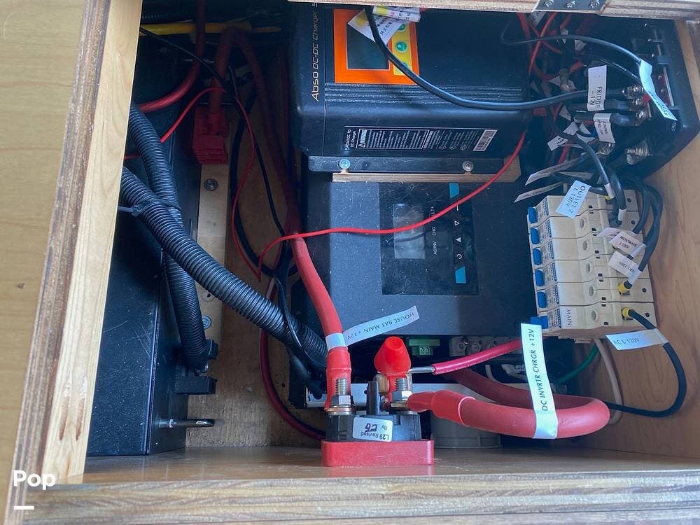 The galley kitchen includes a sink, microwave, conduction cooktop, and a 12-volt fridge that runs off a single house battery charged directly by the engine -- simple and efficient, no solar to fuss with.