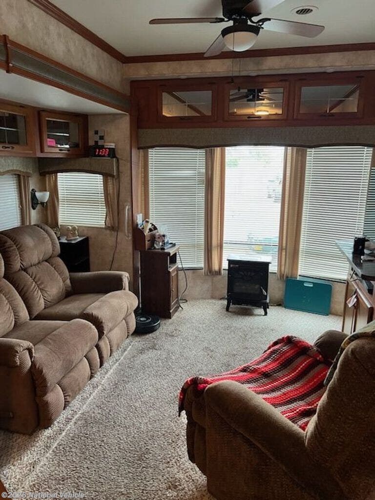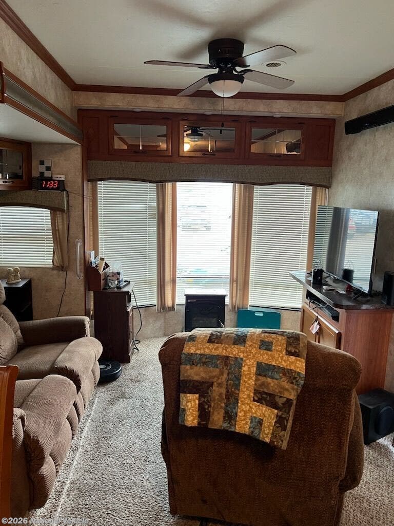 Inside, you?ll find a wide open living area enhanced by large slide-outs and expansive windows that fill the space with natural light. Plush seating and warm residential styling create a comfortable environment for relaxing or entertaining. The open-concept design seamlessly connects the living, dining, and kitchen areas for excellent flow and functionality.