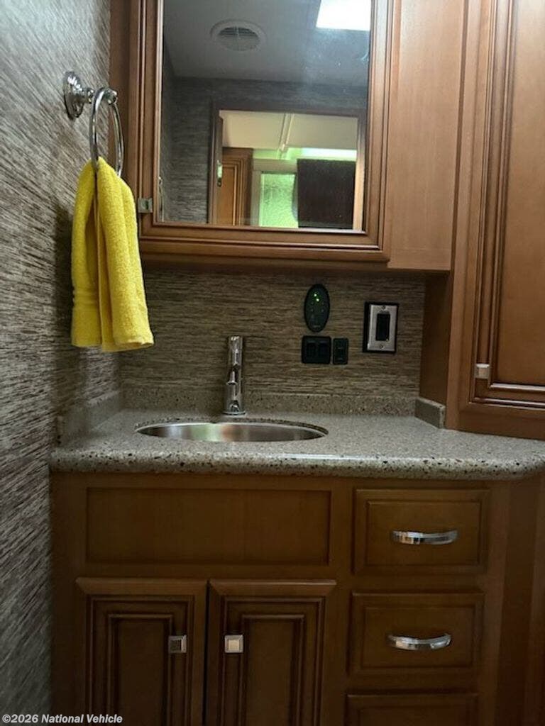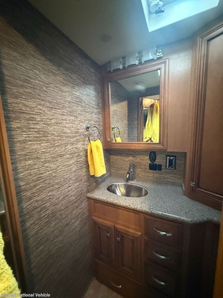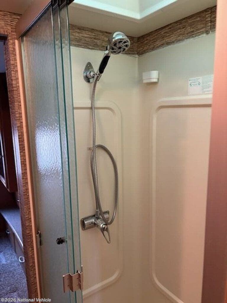 This coach features a bathroom complete with shower, toilet, and a sink with a medicine cabinet above for your convenience.