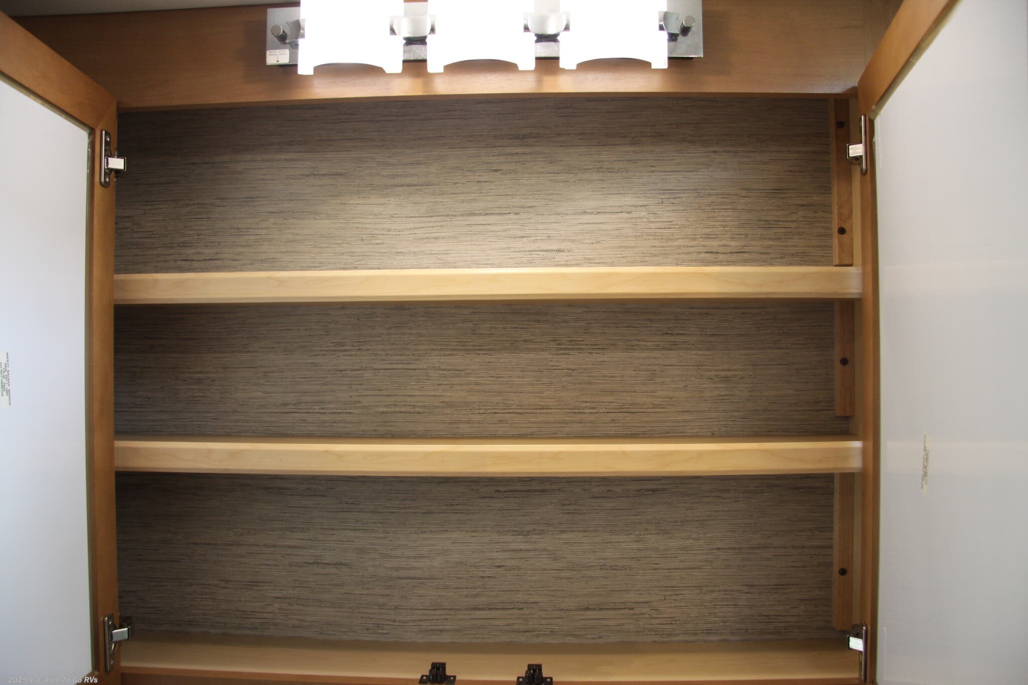 The interior is appointed with Newmar's signature fit and finish, including solid surface countertops, hardwood cabinetry, tile flooring throughout, an RV refrigerator, convection microwave, dual A/C units with ducted heat/cooling, and sleeping capacity for up to six people.
