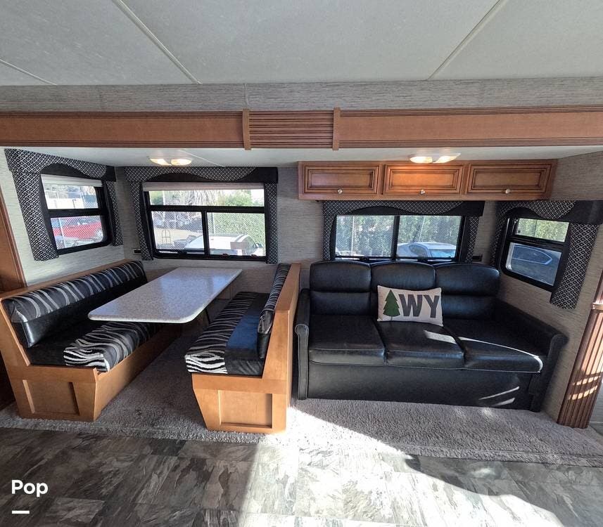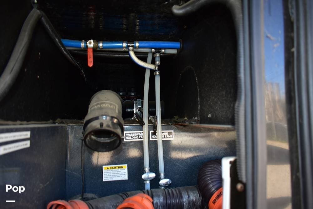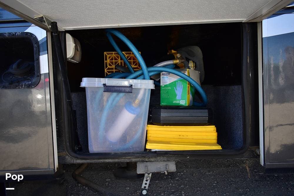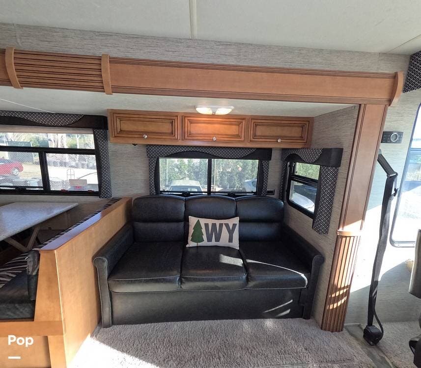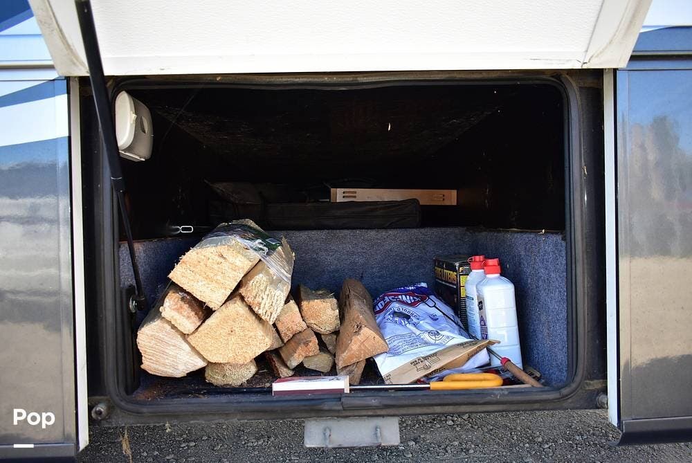 The coach also features a power patio awning, fiberglass exterior for low‑maintenance good looks, stabilizer jacks for a solid feel at camp, and generous holding tanks to support longer stays without sacrificing convenience.