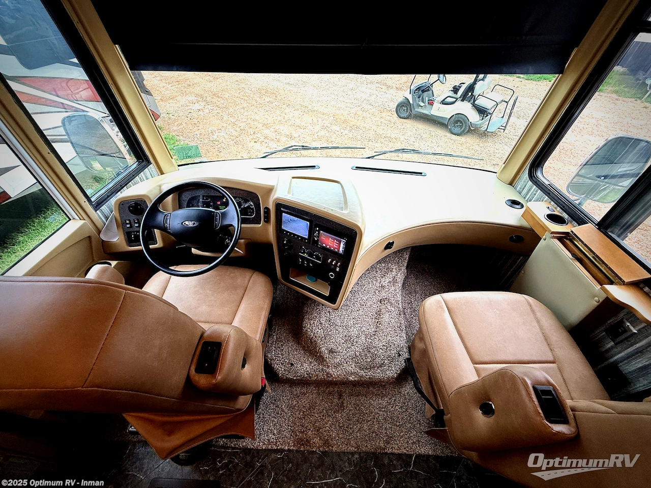 As you enter the motor coach, to the right is the driver and passenger's chairs that rotate to provide more seating in the living and kitchen area. There is additional storage above the cab.