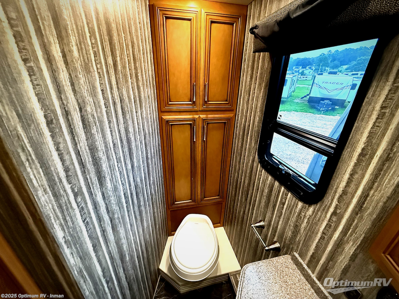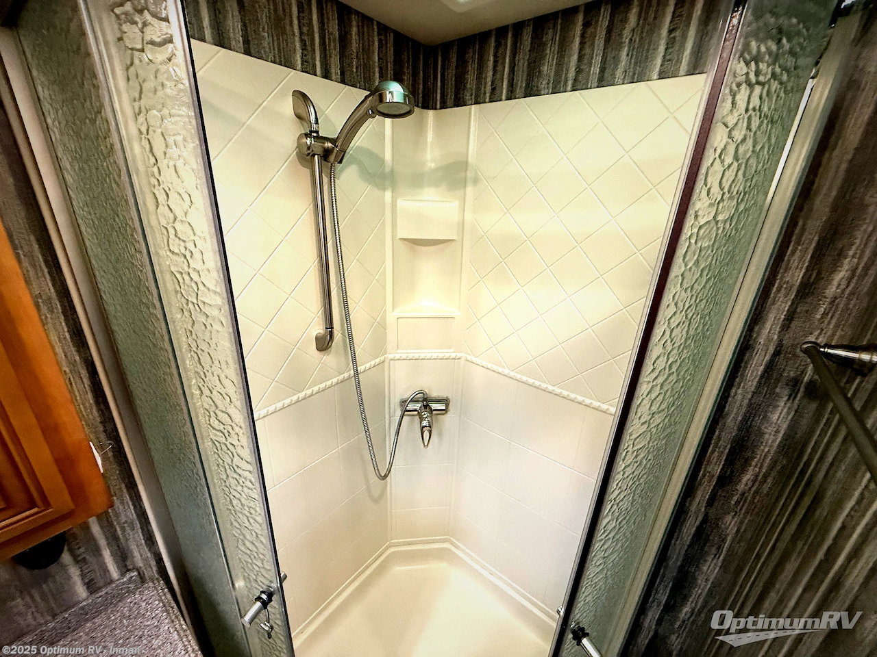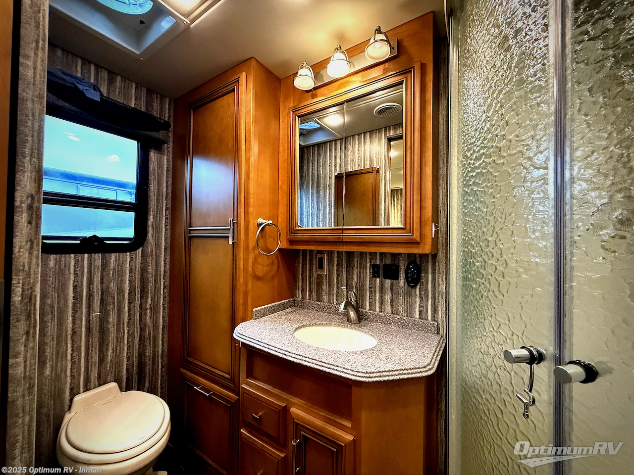 The master bath is located in the rear of the motor coach. The bath includes a toilet, corner shower, sink, and linen storage.