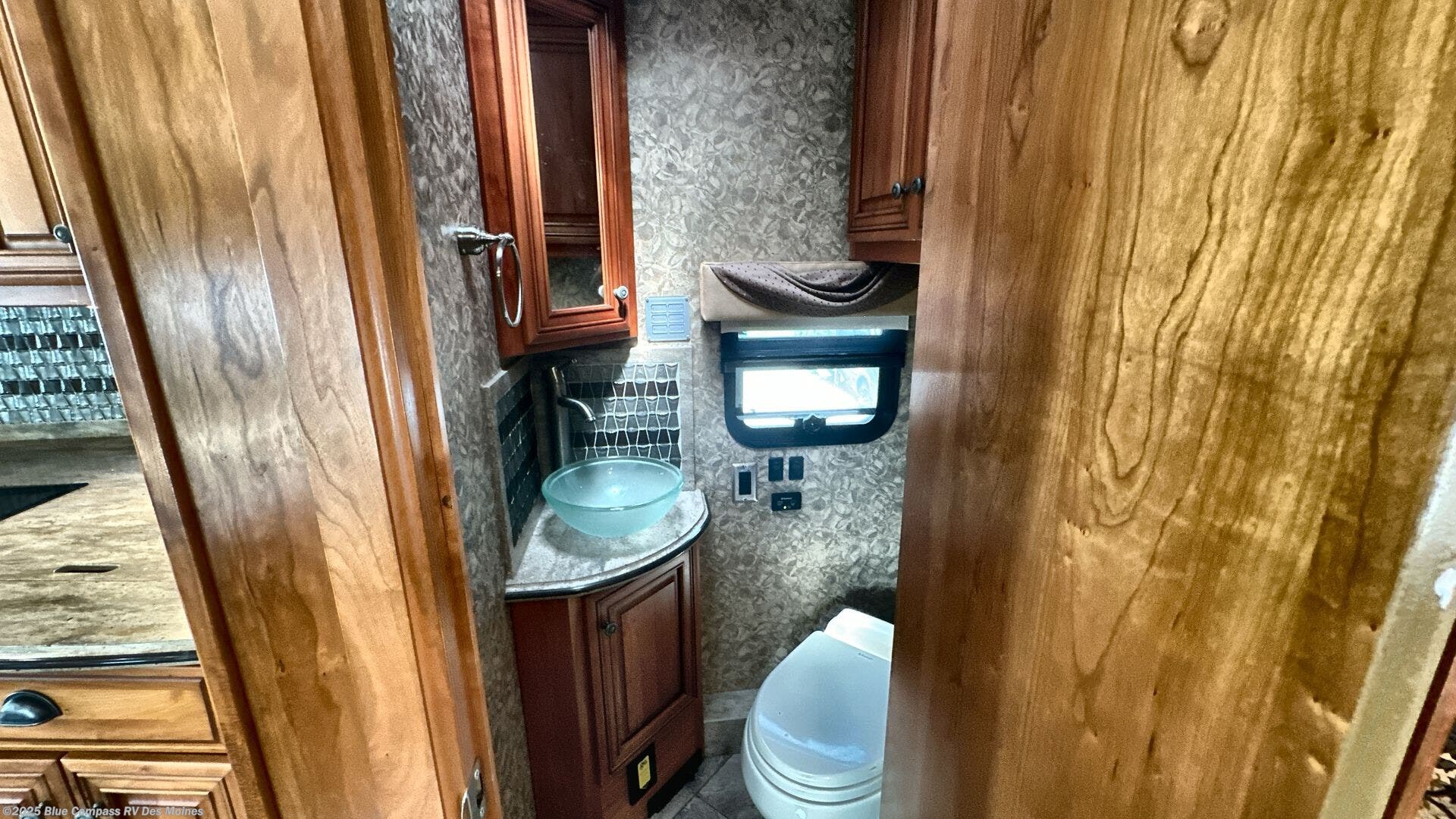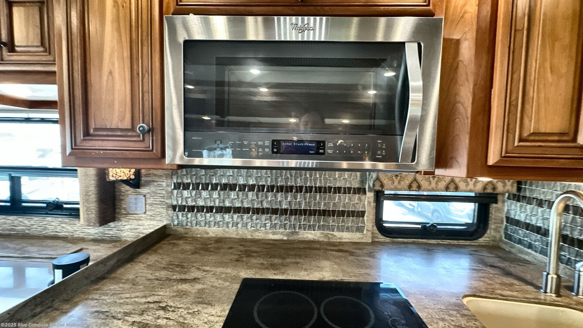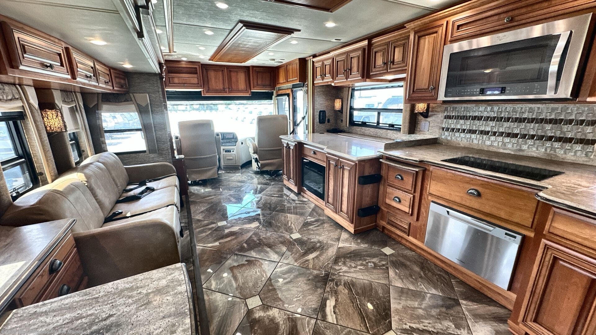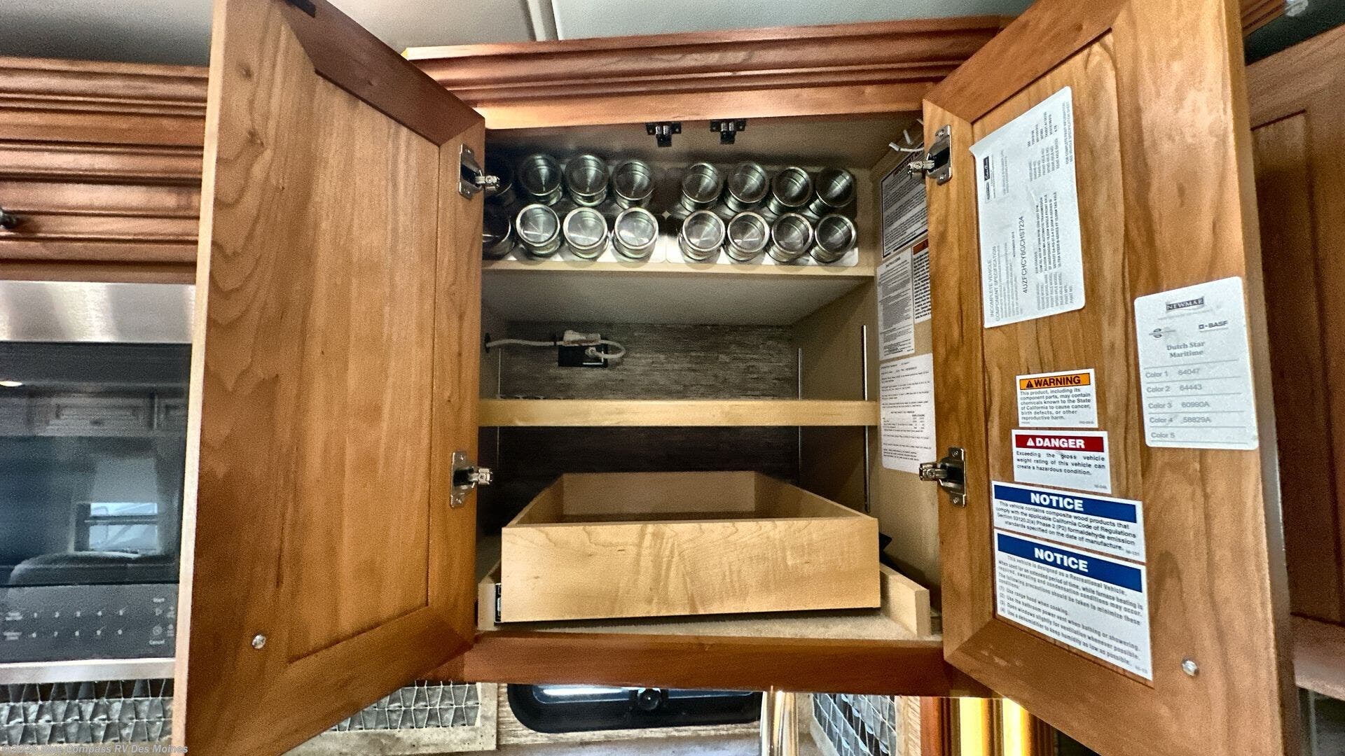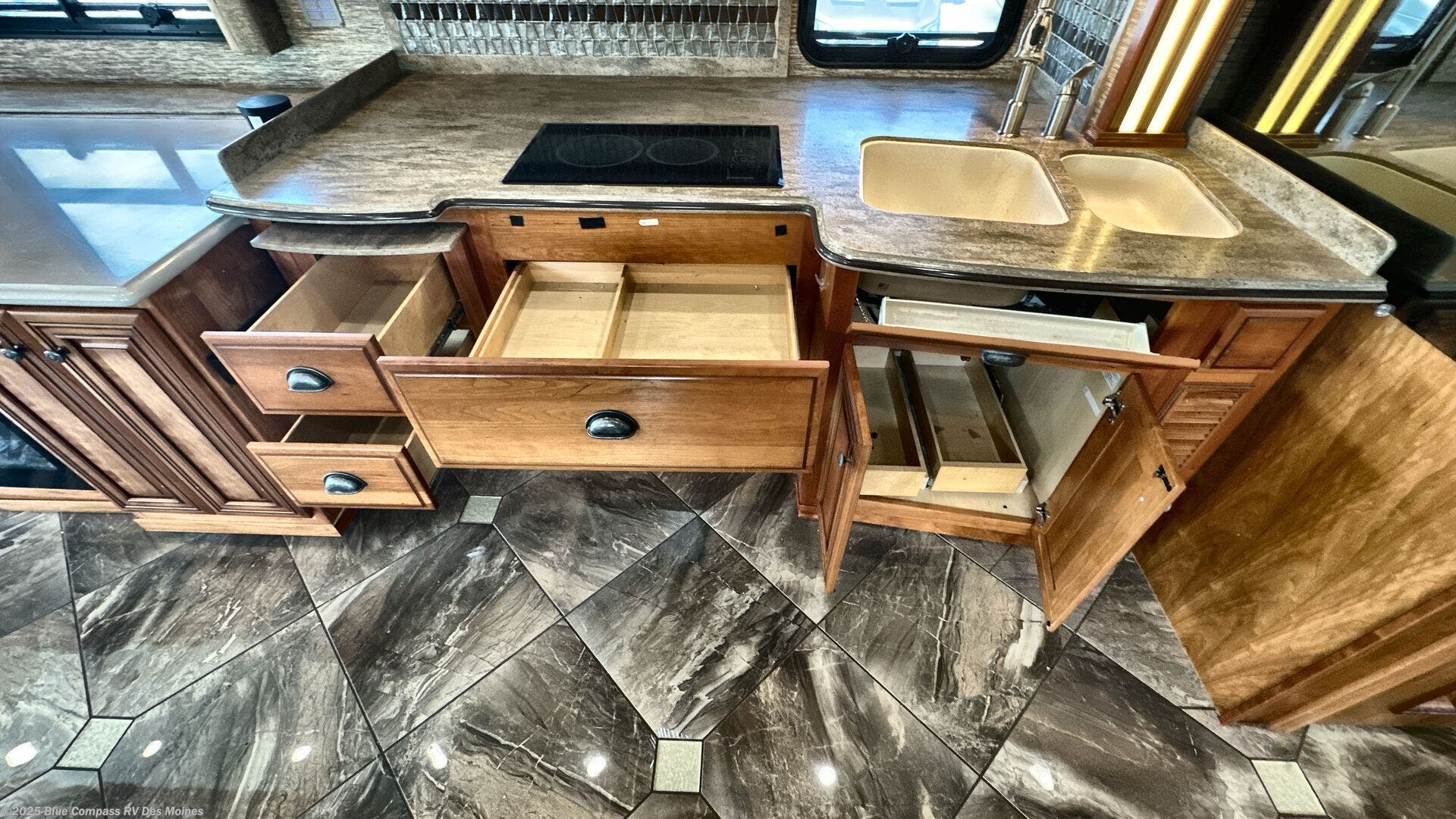As you enter this motor home, your eyes will be drawn to not only the beauty but also the space that is offered. Both the driver and passenger seats swivel around for added seating. Behind the passenger's seat there is a slide with a jack-knife sofa, pull-out cabinet, three burner range, and large sink. The overhead cabinet can easily hold dishes. The slide along the road side has a hide-a-bed sofa, hide-a-leaf dinette where you can enjoy your meals, refrigerator, large pantry, and continuing into the bedroom the slide has two wardrobes, a chest of drawers, and overhead TV.