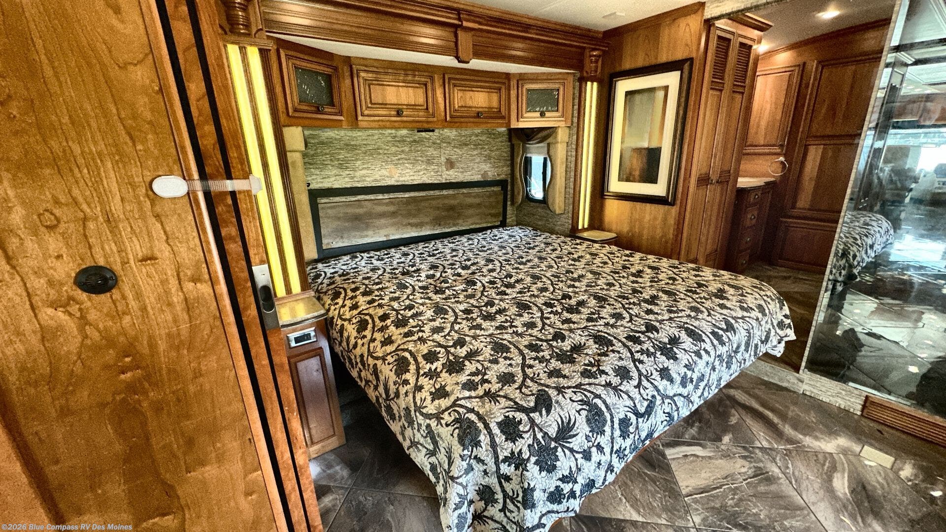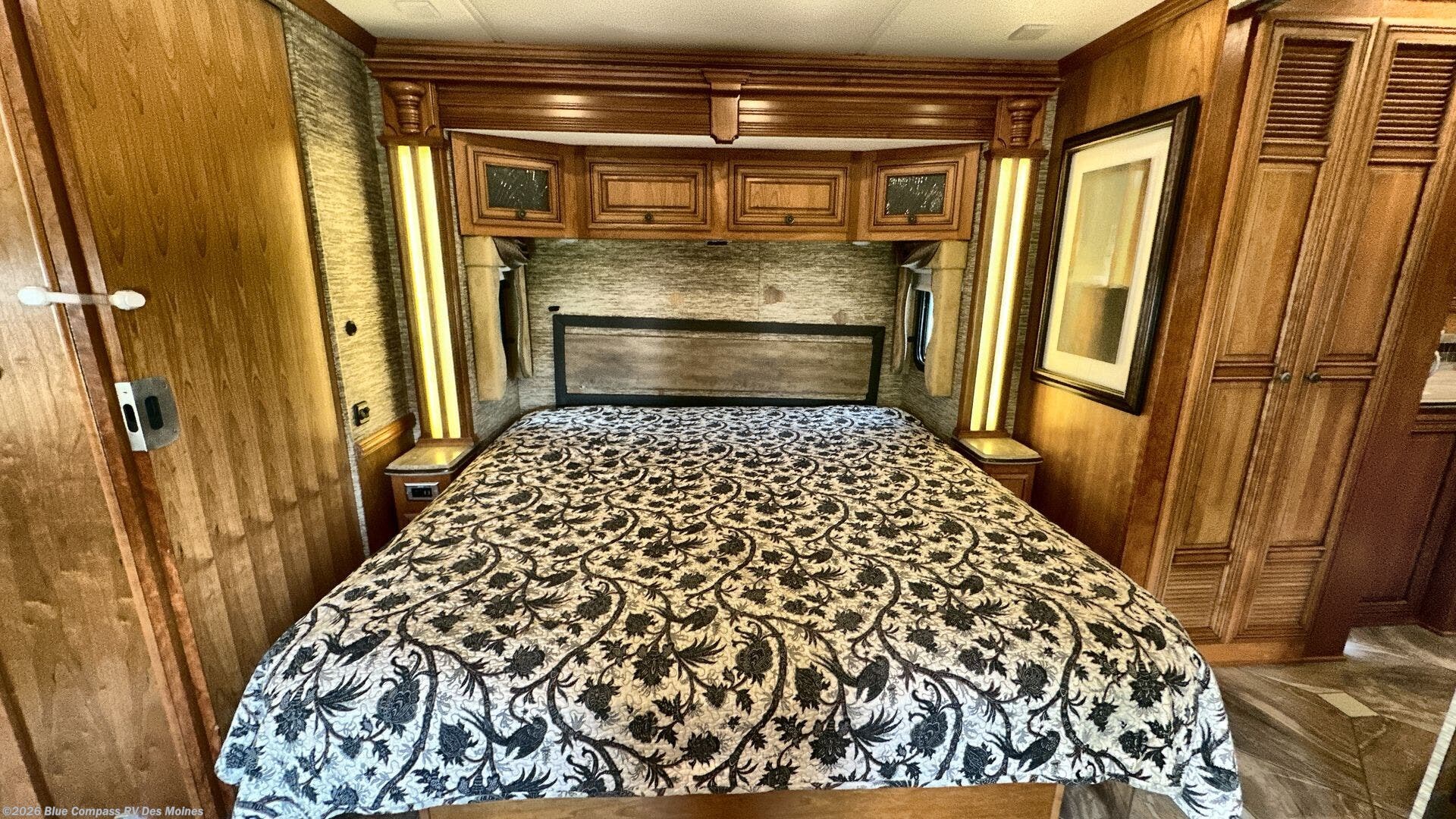 Retreat to the master bedroom where there is a sliding door for privacy at night. The king bed is on a slide and above the bed there is an overhead cabinet. Next to the bed on both sides you will find nightstands.