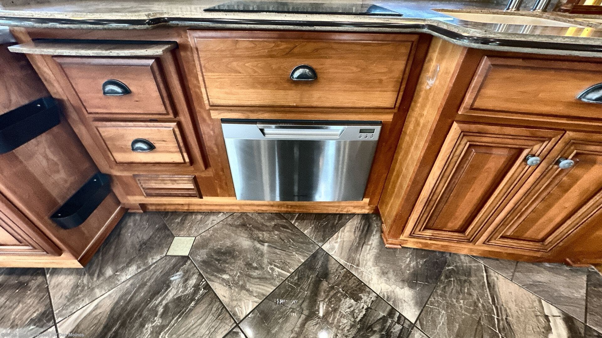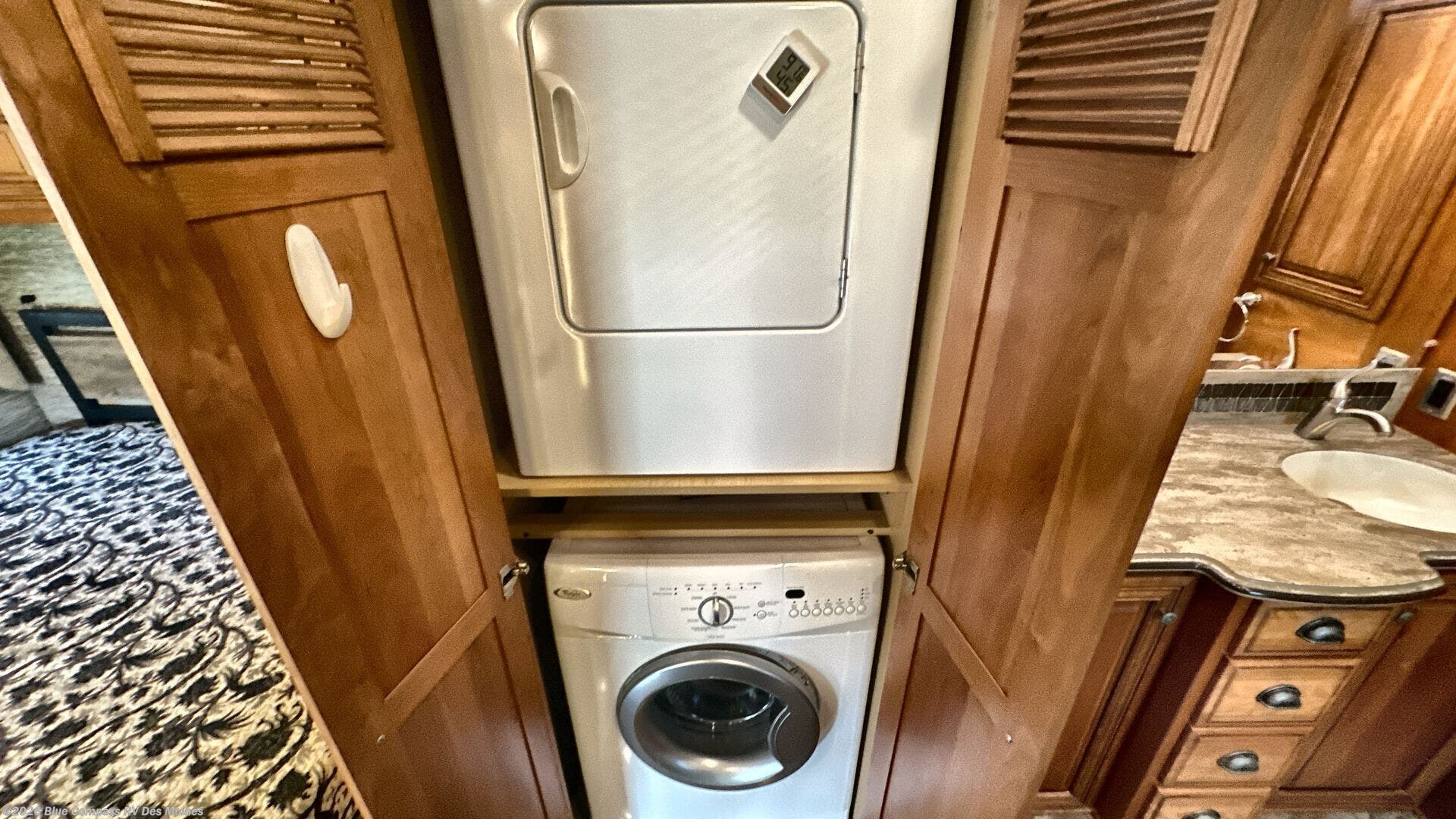 As you enter this motor home, your eyes will be drawn to not only the beauty but also the space that is offered. Both the driver and passenger seats swivel around for added seating. Behind the passenger's seat there is a slide with a jack-knife sofa, pull-out cabinet, three burner range, and large sink. The overhead cabinet can easily hold dishes. The slide along the road side has a hide-a-bed sofa, hide-a-leaf dinette where you can enjoy your meals, refrigerator, large pantry, and continuing into the bedroom the slide has two wardrobes, a chest of drawers, and overhead TV.