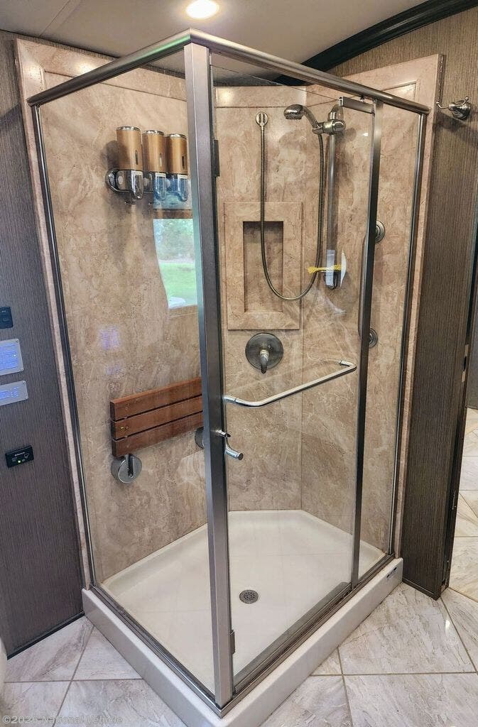-Glass shower with teak fold-down seat
