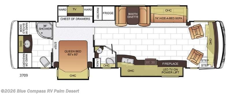 As you enter the coach, the full wall slide features a 74" hide-a-bed sofa, booth dinette, refrigerator, and pantry for your non-perishables, plus in the bedroom there are two wardrobes, chest of drawers, and an overhead TV. On the opposite side there is a double kitchen sink on an angled countertop, three burner range, fireplace with LED TV on a power lift, and overhead cabinets stretching the whole lengthn of the slide out.