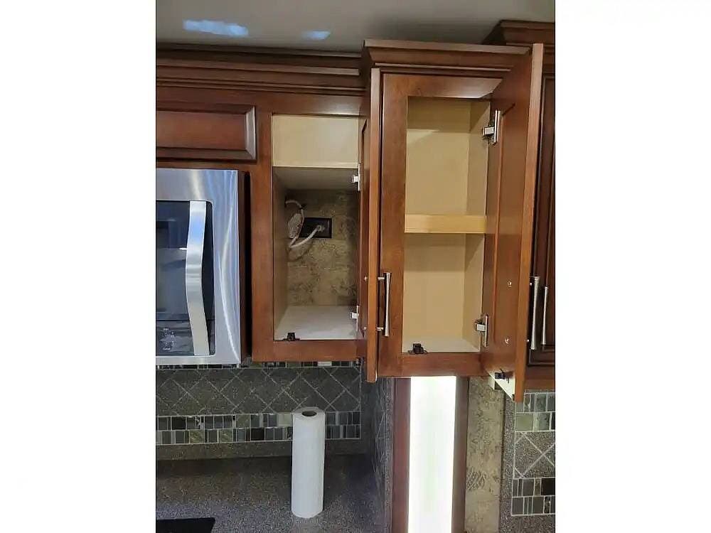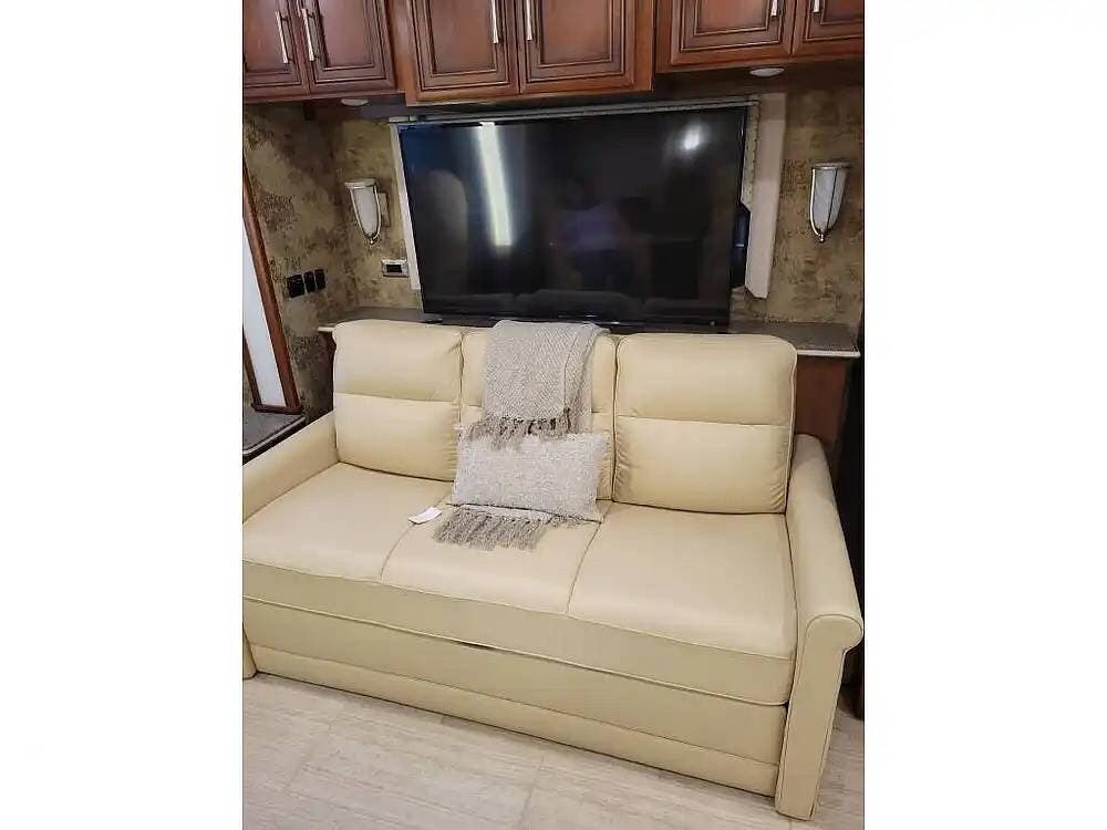 Up front, the cockpit features opposing captain's chairs with overhead storage, flowing into a living area with a jackknife sofa and LED TV on power lift. A hide-a-bed sofa sits underneath the TV for flexible seating and sleeping.
