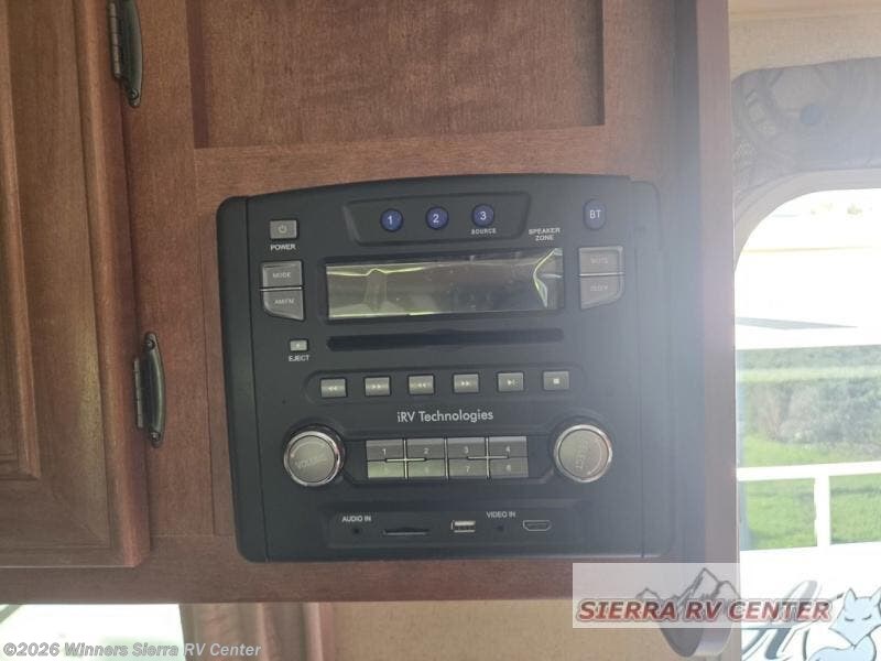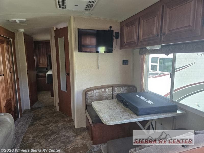 Across, a booth dinette provides room for meals. A second entry door in just beyond the booth and there is a TV mounted above the front booth seat, on the outside wall of the bathroom.