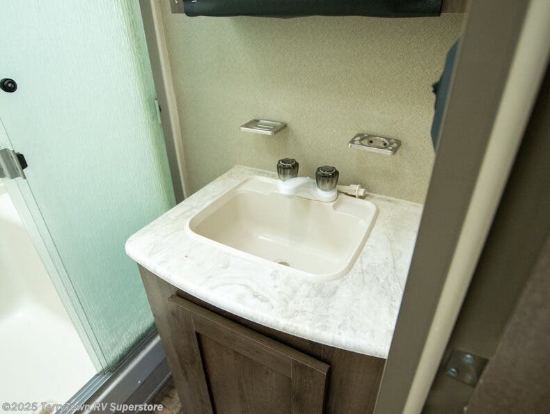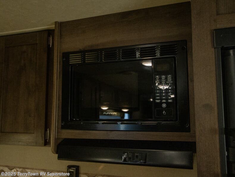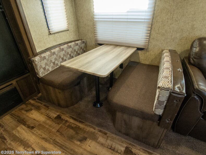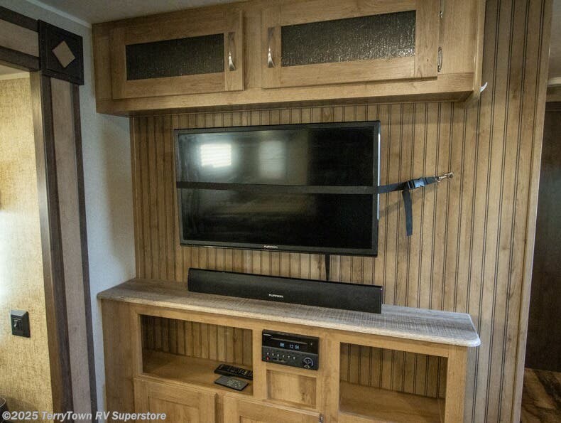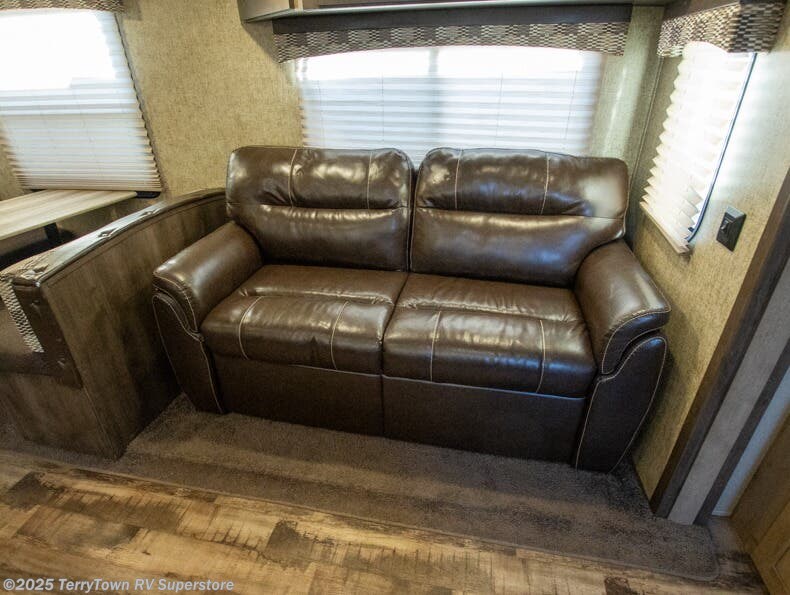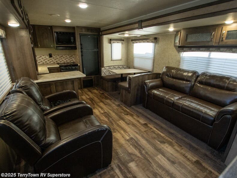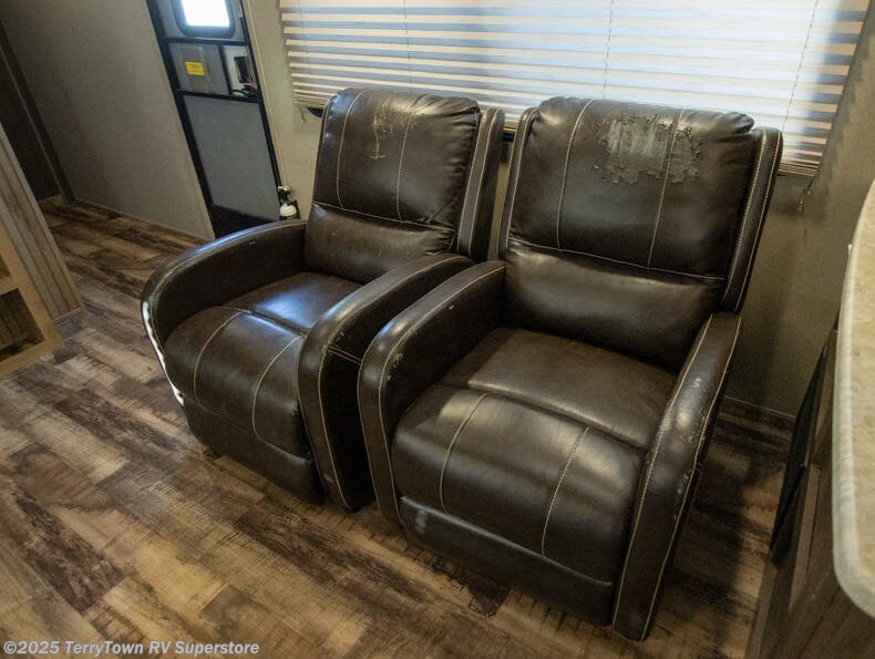 To the left from the entrance you will enjoy a living area with two recliners just inside the door including overhead storage. There is a nice entertainment center found along the interior wall for easy viewing from the recliners, or from the sofa/dinette slide out along the road side wall. There is additional storage above the sofa for your things, and you can easily create sleeping for added guests at night with each.