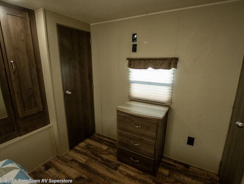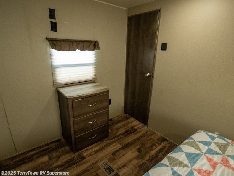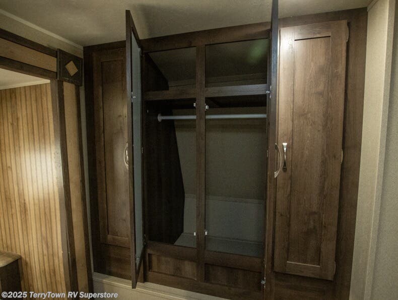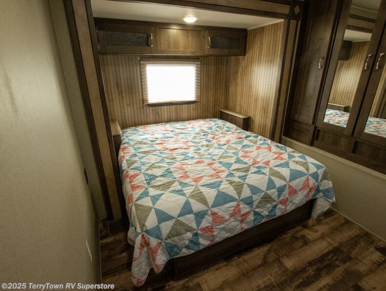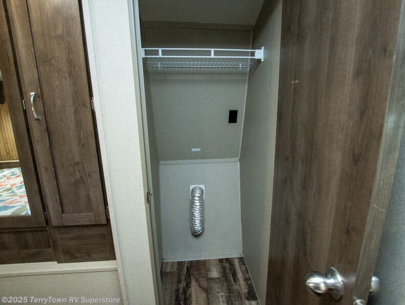 Continue to the front and find a spacious master bedroom with queen slide out bed that includes overhead storage and nightstands. There is a dresser opposite the bed, and a full front closet with a washer/dryer prep option.