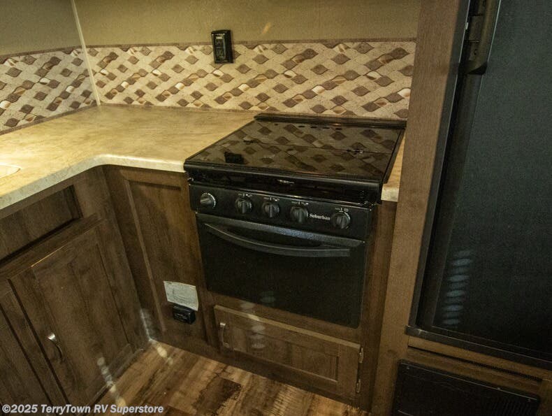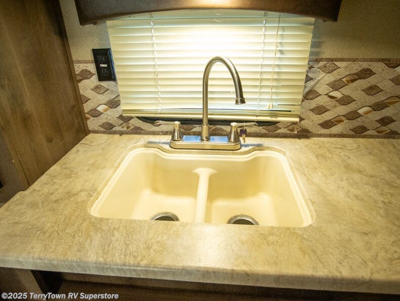 The kitchen is at the rear of this Puma model and features a u-shaped counter with pantry storage, a double sink, and three burner range, plus a refrigerator. There is also plenty of counter space and storage both above and below, and so much more!