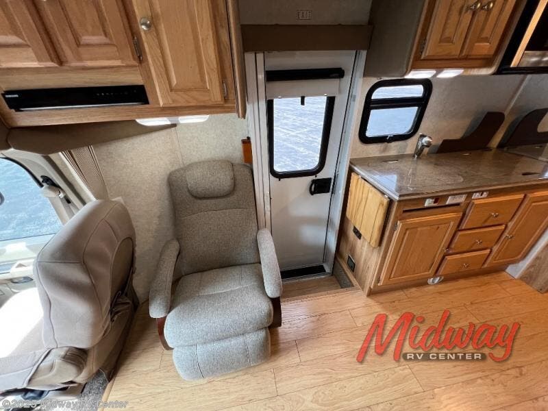 This 2552 Phoenix Cruiser Class B+ motor home is just like the 2551 but with a standard slide. It features a booth dinette within the slide in place of a sofa bed which can be added if you choose. There is also an added swivel chair for additional seating and an entertainment center above the cab area that can be viewed throughout the coach.
