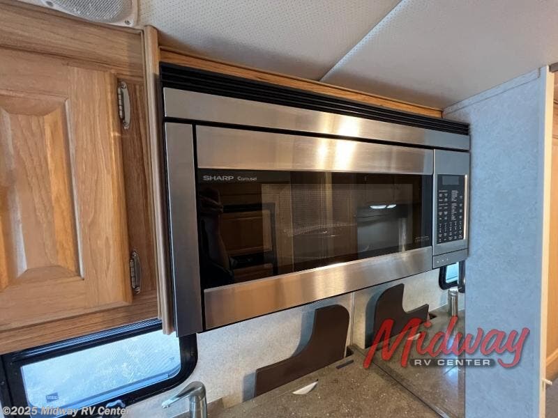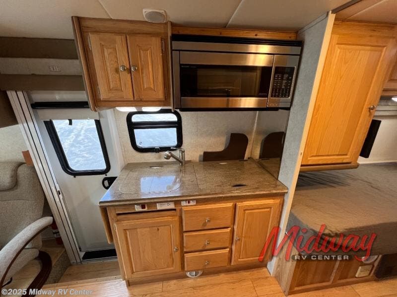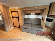 Step inside and see the convenient open space inside with the slide-out dinette and refrigerator with overhead storage cabinet. To the left of the main entry door you will find a two burner range top with overhead storage and sink, plus a counter extension along with a microwave oven also.