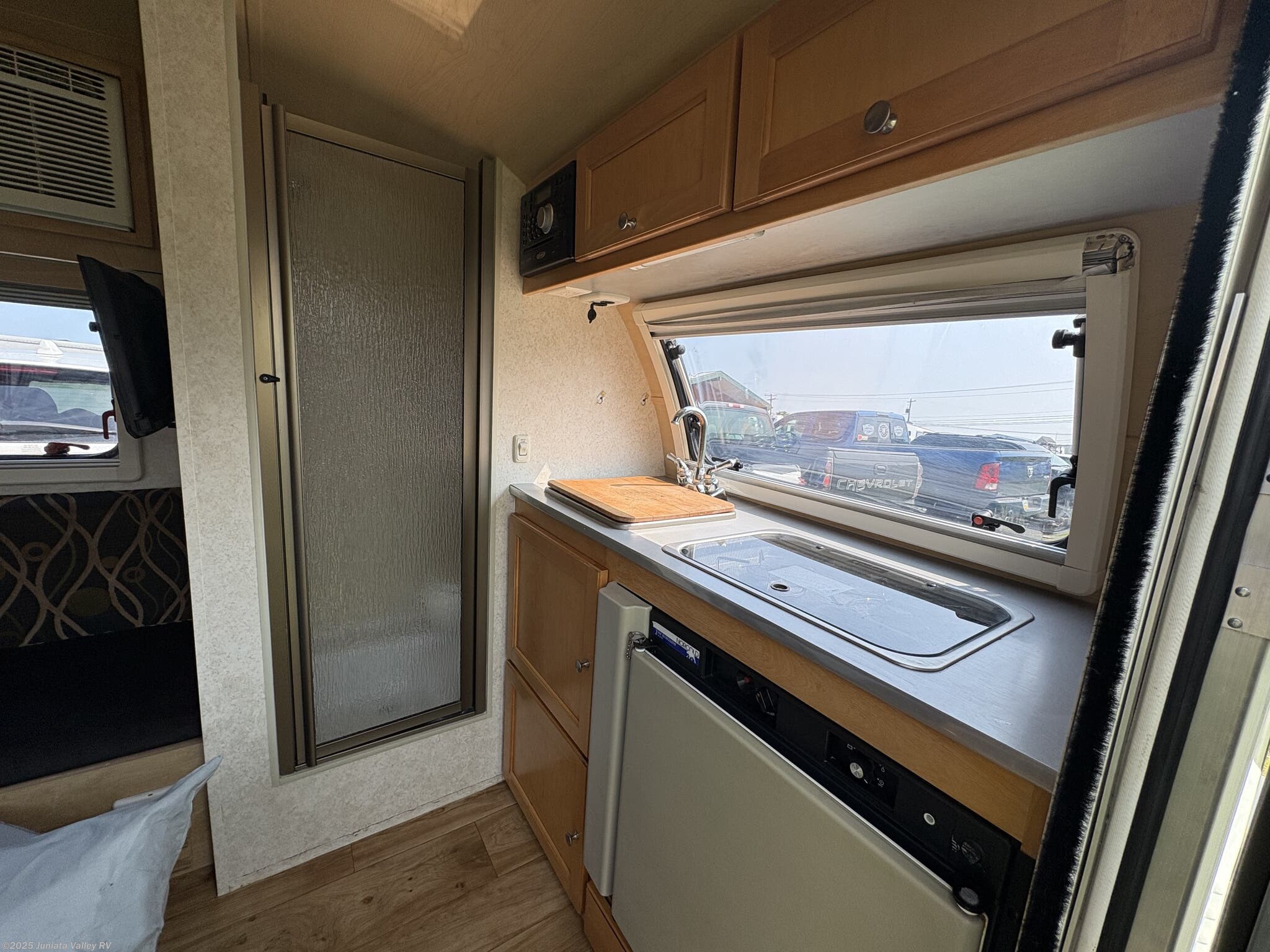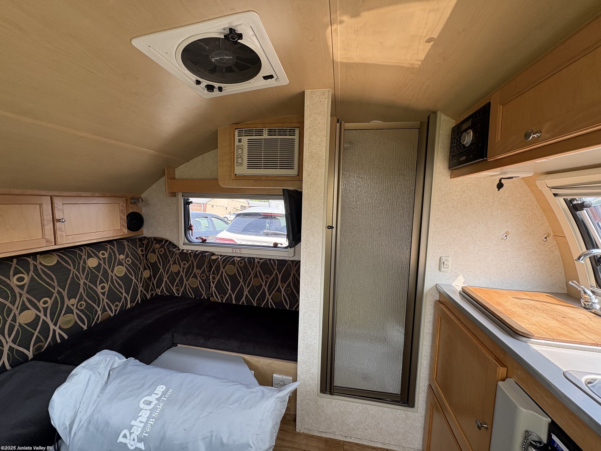 Designed with comfort in mind, this travel trailer features a cozy queen bed with a quality queen mattress, perfect for restful nights. The interior showcases a well-appointed living area with a booth dinette that converts into an extra sleeping space, along with ample overhead cabinetry and a removable table. The unit comfortably sleeps 2 occupants and offers the convenience of a full bathroom with a glass shower door and a modern kitchen equipped with a stove, kitchen sink, and a refrigerator—though the refrigerator capacity isn’t specified, it includes both 12V and standard options for flexible cooling solutions.