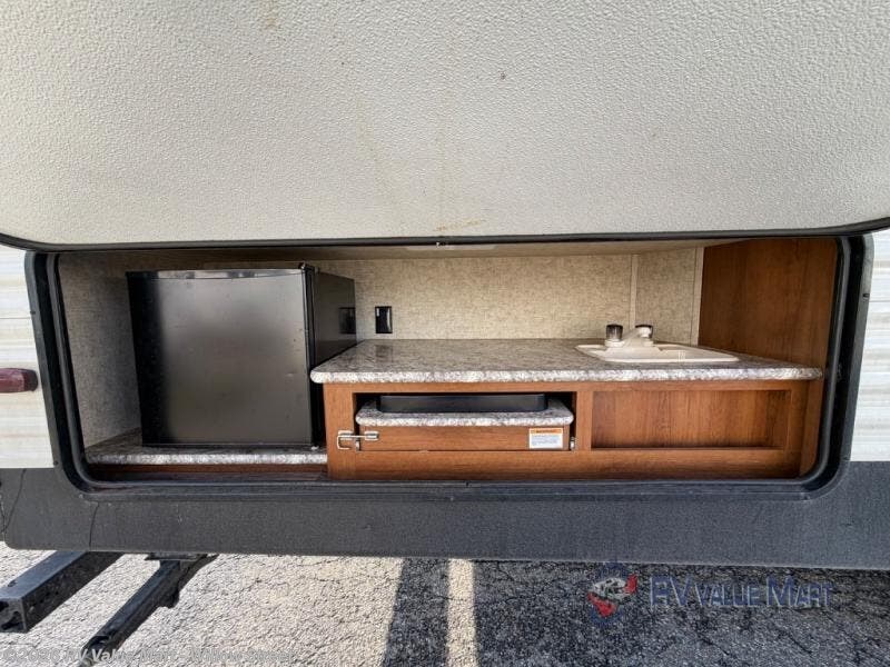 On the outside of this Avenger ATI there is an outdoor kitchen for the chef in the family to enjoy. Here you will find a refrigerator, a single sink, and two burner cook-top, plus so much more!