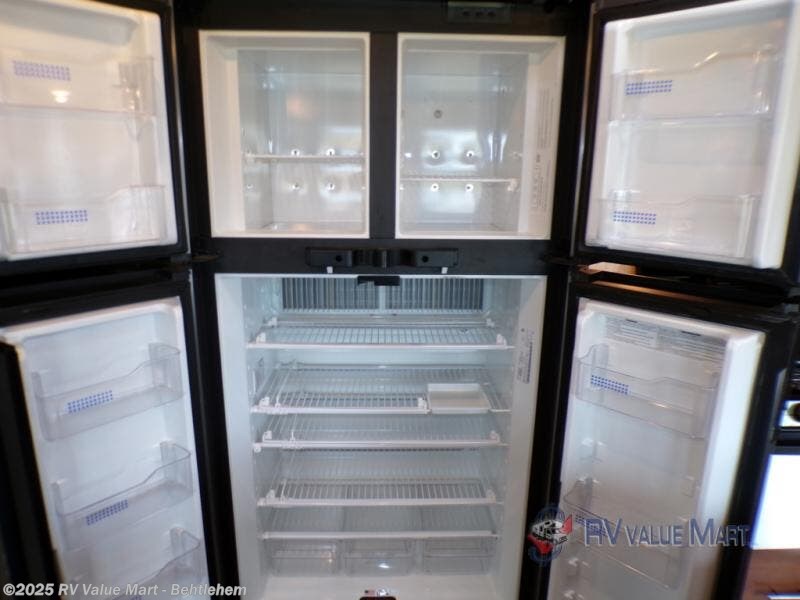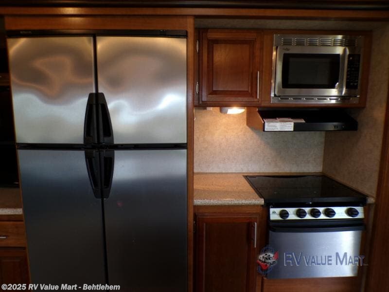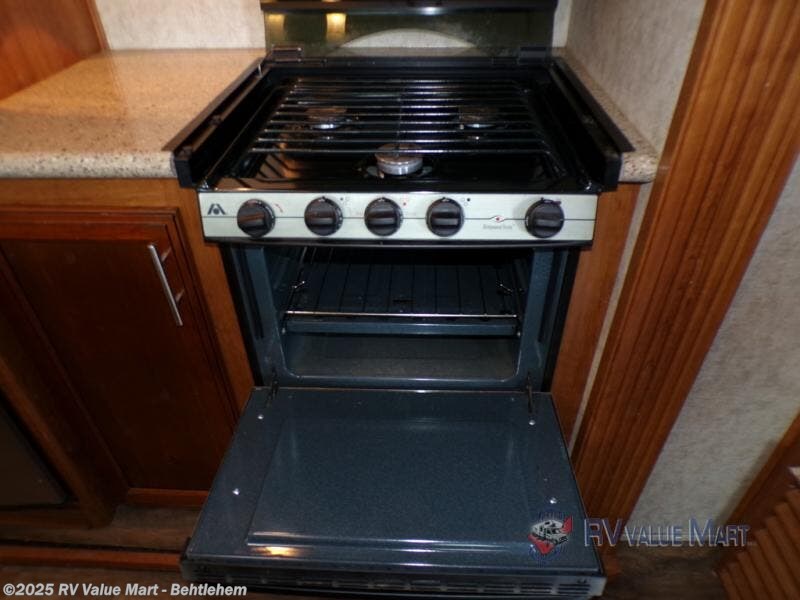 As you enter the travel trailer, to the left there is a slide with a free-standing table and chairs plus an entertainment center. On the opposite side of the trailer you will find an additional slide with theater seating with overhead storage, a refrigerator, pantry, and three burner range. Next to the slide there is a large pantry for additional non-perishables. In the middle of the kitchen you can enjoy the extra counter space that the kitchen island offers as well as the double sink. Along the rear wall there is a hide-a-bed sofa with nightstands on either side of the sofa including overhead cabinets.
