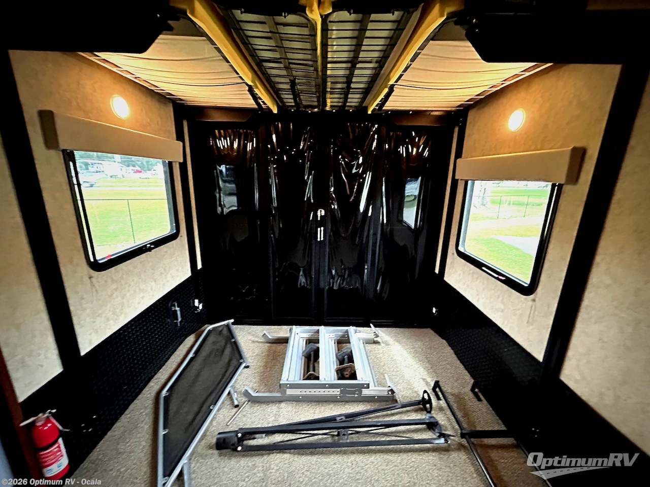 The Spartan 1234X toy hauler fifth wheel by Prime Time Manufacturing offers double slides and plenty of room in the cargo area.