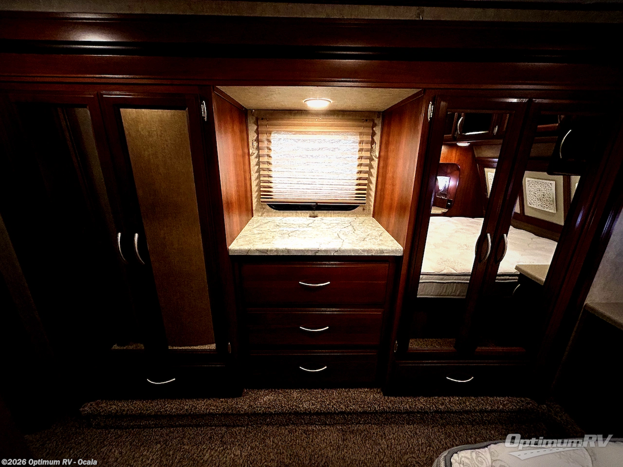 There are two sets of stairs. The first will lead you into the bathroom. The bathroom has a corner shower, toilet, and sink. The second set of stairs will take you directly into the bedroom. There is a slide with two closets and a chest of drawers. You will also find a queen bed with plenty of overhead cabinets above the bed. In the corner there is an entertainment center, and more!