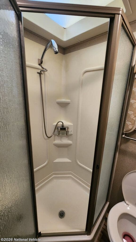 Bathroom: Rear bath, typically with an angled shower, toilet, and sink.