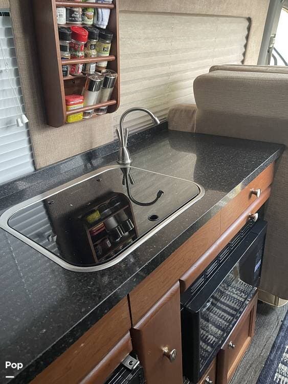 Inside, the galley is equipped with a stainless-steel sink, a two-burner propane stove, a refrigerator, a microwave, and solid-surface countertops. LED lighting, efficient ventilation, and large windows make the cabin bright and practical for daily use.