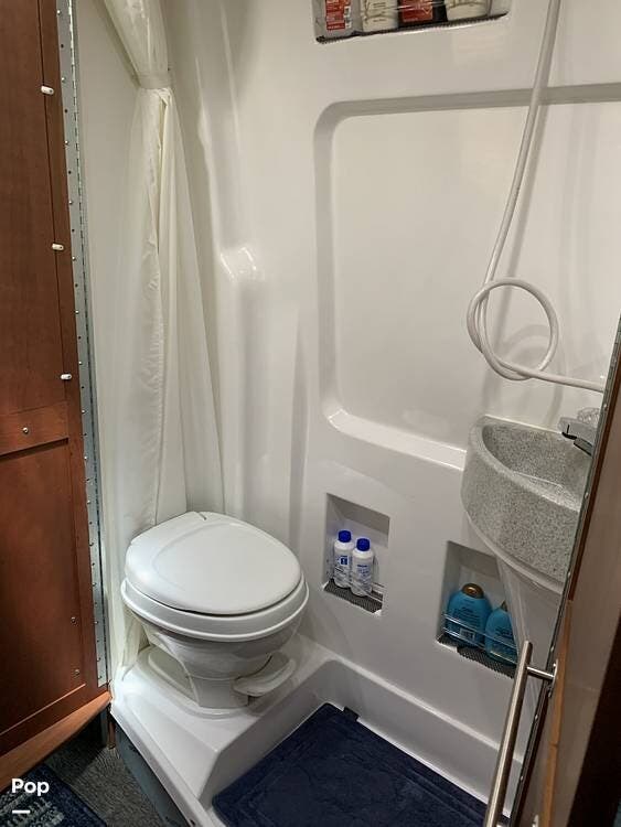 The mid-coach wet bath includes a marine toilet, sink, and shower, designed to maximize space and function.