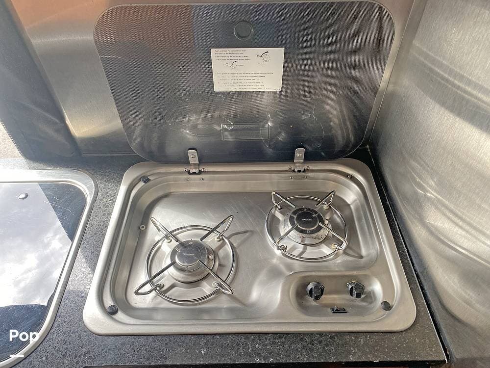 This Zion features onboard solar power (200-300 W), an enclosed bathroom and shower, cabinetry with a stove and pantry, and a rear sleeping area for up to two people.