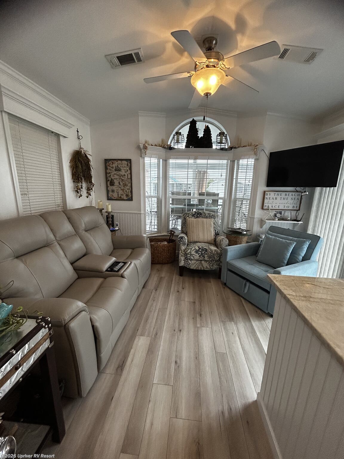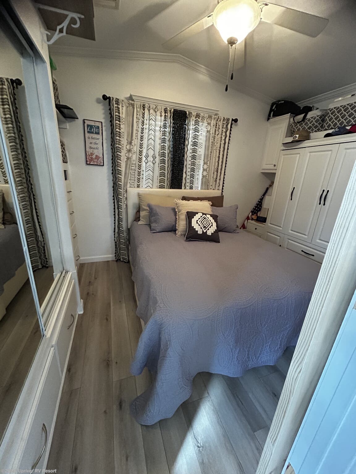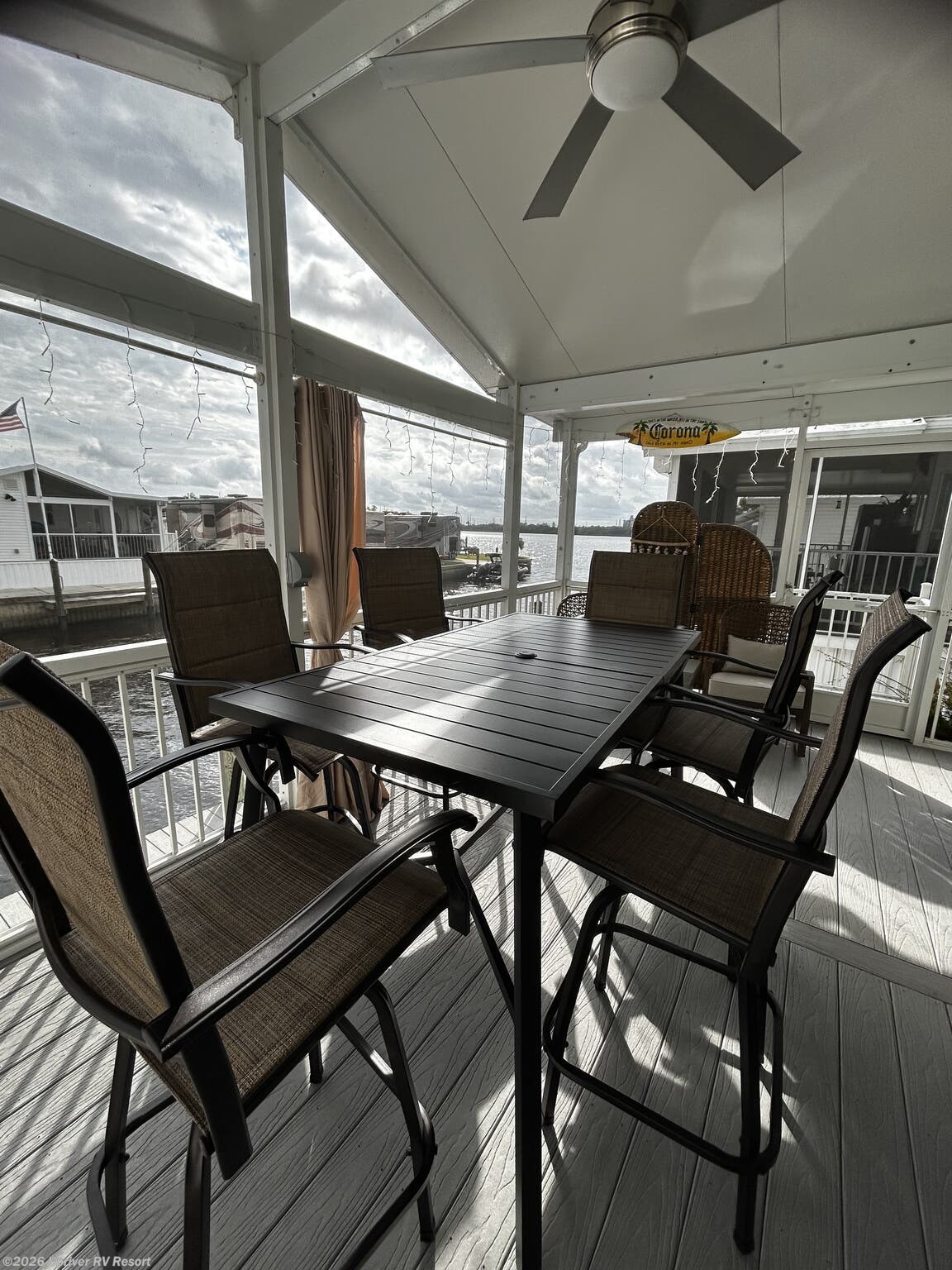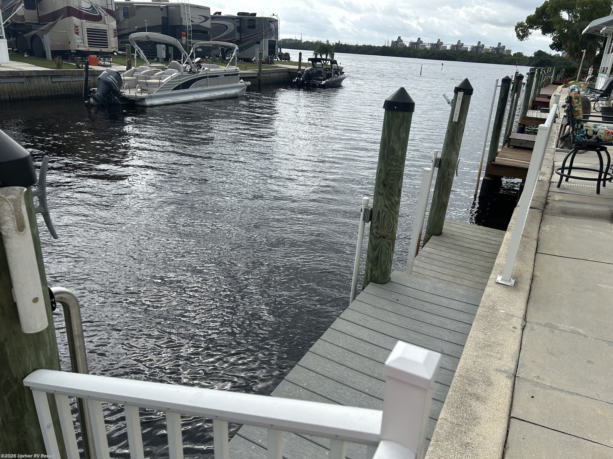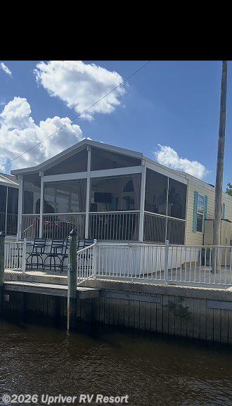2016 Skyline Park Model on the West Drive. This unit sits on full concrete and has spray foam underneath. There is a fully screened in porch with composit deck over looking the canal, has a 27 foot boat dock. On the inside, it has valulted ceiling with window cornice and crown molding throughout. Quartz countertops, Whirlpool refridgerater new January 2026. There is a full size stackable washer & Dryer. The bedroom has a full size closet and 6 foot wardrobe with with shelves, drawers and hanging capacity. New barn door on bedroom. A rolling island with 2 barstools. The roof new Novemeber of 2023. Water heater replaced December 2025.