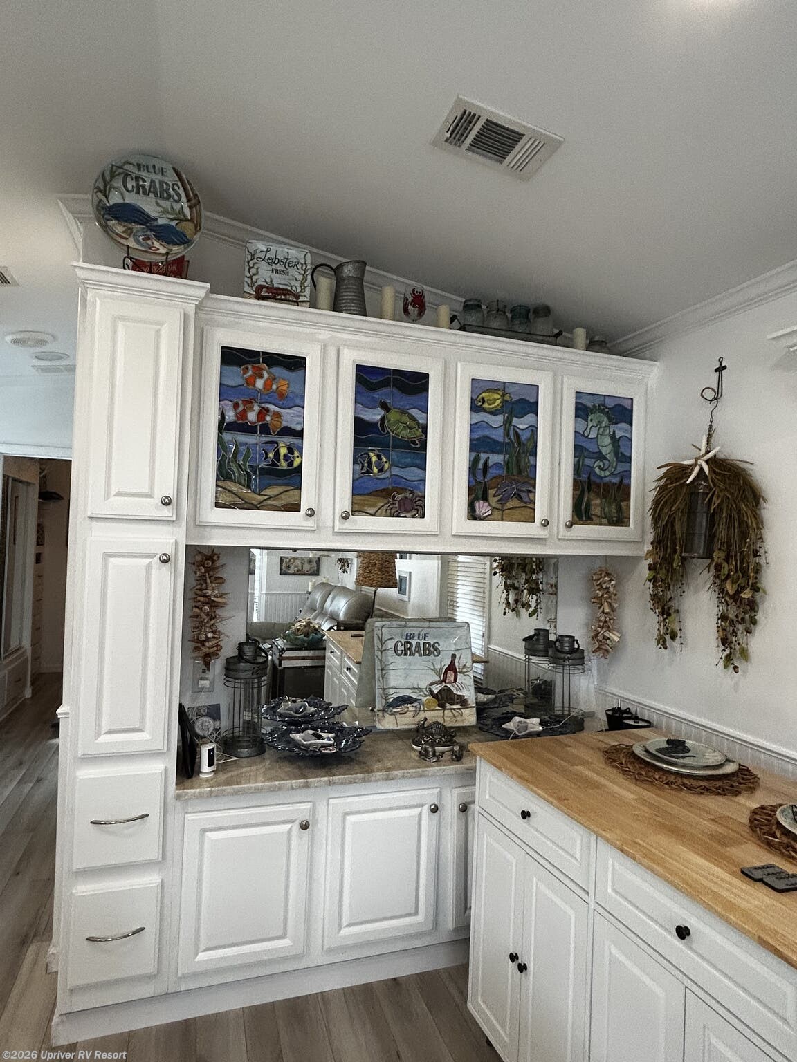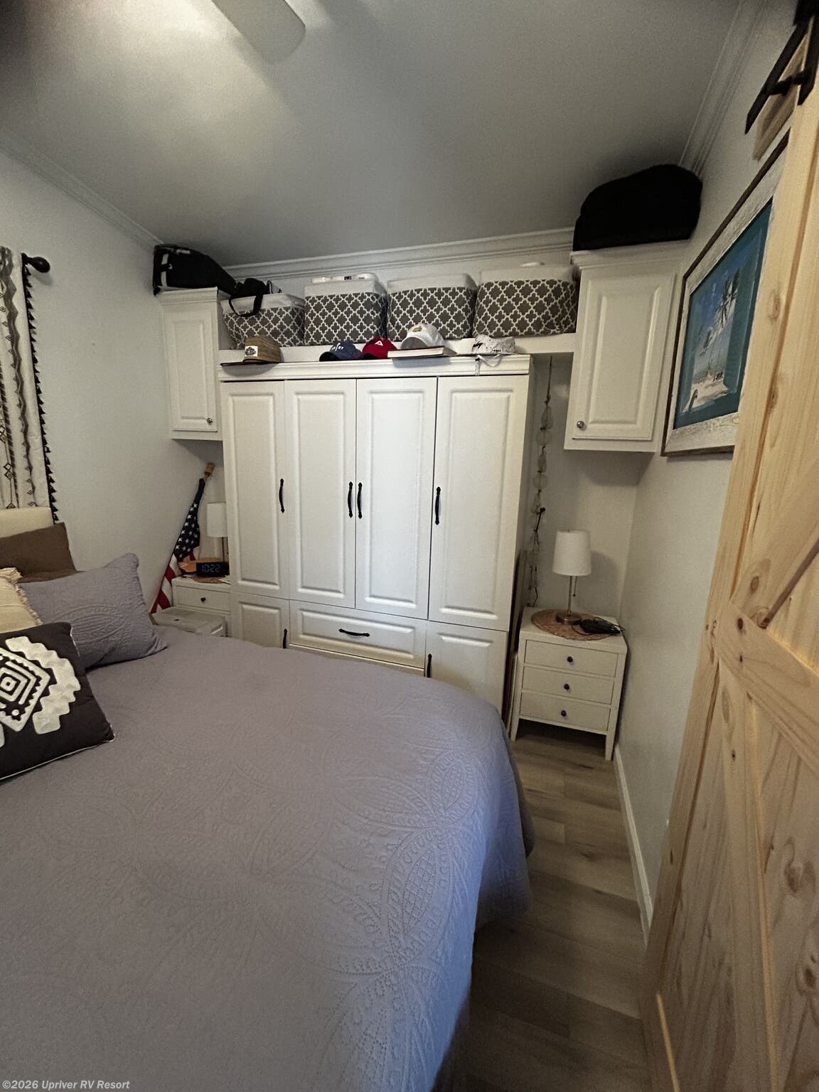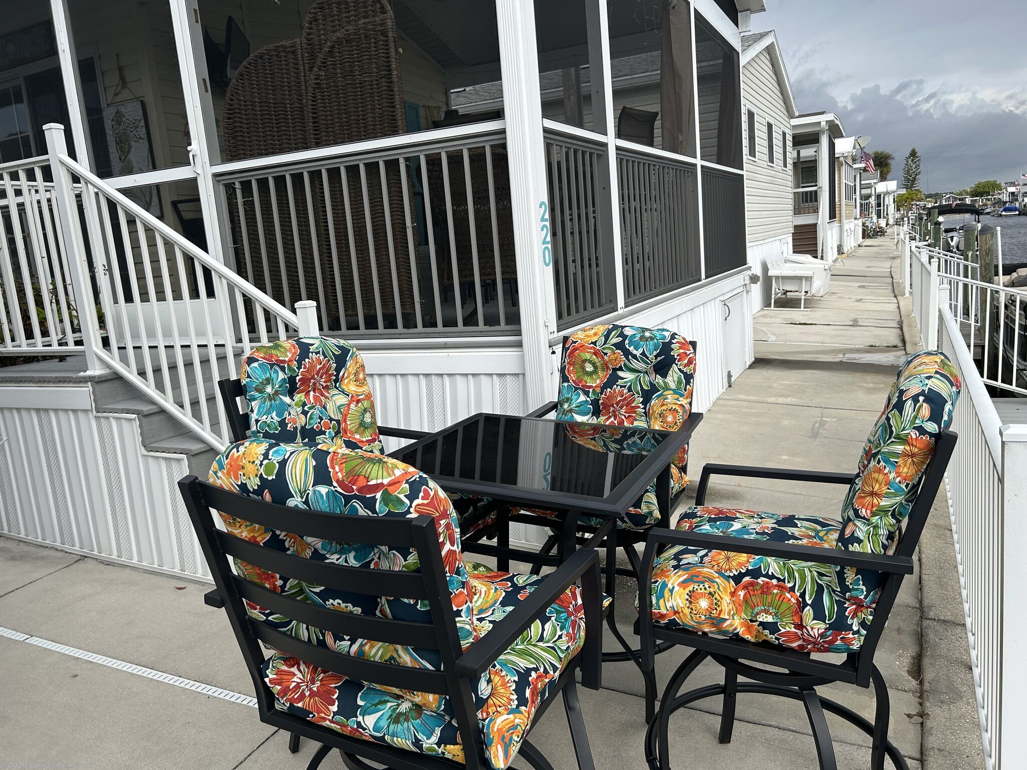 2016 Skyline Park Model on the West Drive. This unit sits on full concrete and has spray foam underneath. There is a fully screened in porch with composit deck over looking the canal, has a 27 foot boat dock. On the inside, it has valulted ceiling with window cornice and crown molding throughout. Quartz countertops, Whirlpool refridgerater new January 2026. There is a full size stackable washer & Dryer. The bedroom has a full size closet and 6 foot wardrobe with with shelves, drawers and hanging capacity. New barn door on bedroom. A rolling island with 2 barstools. The roof new Novemeber of 2023. Water heater replaced December 2025.