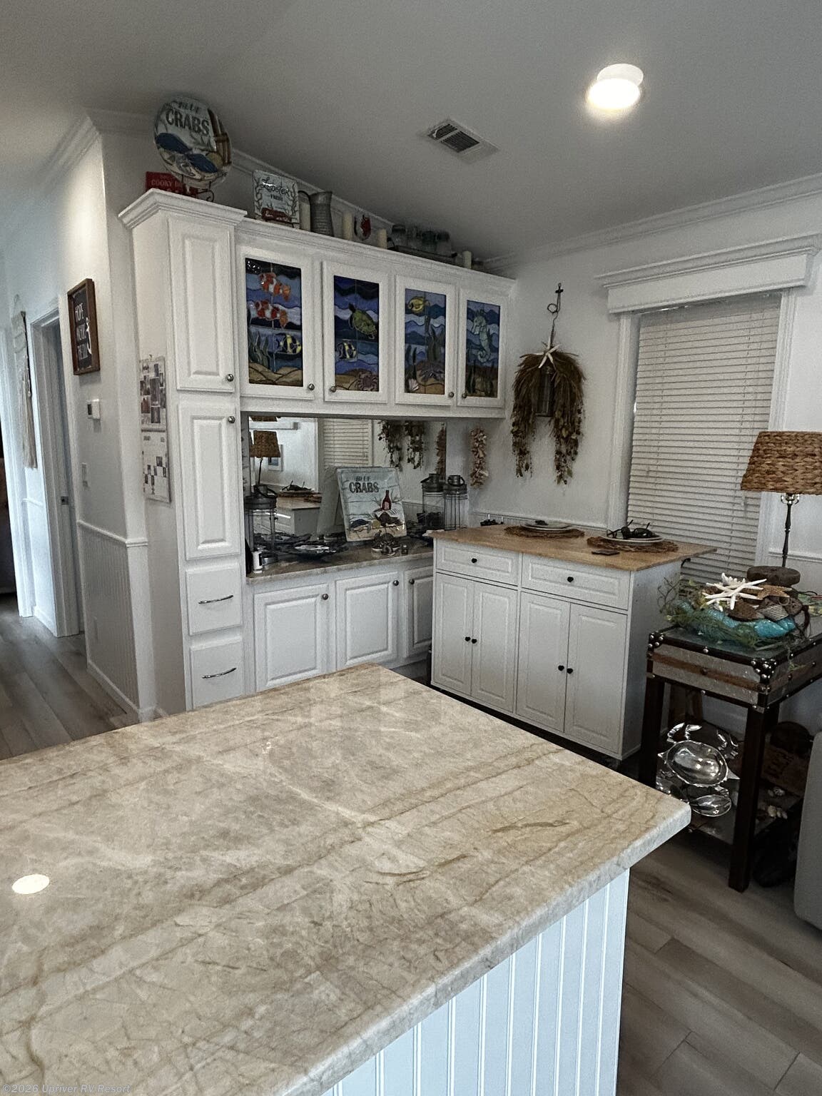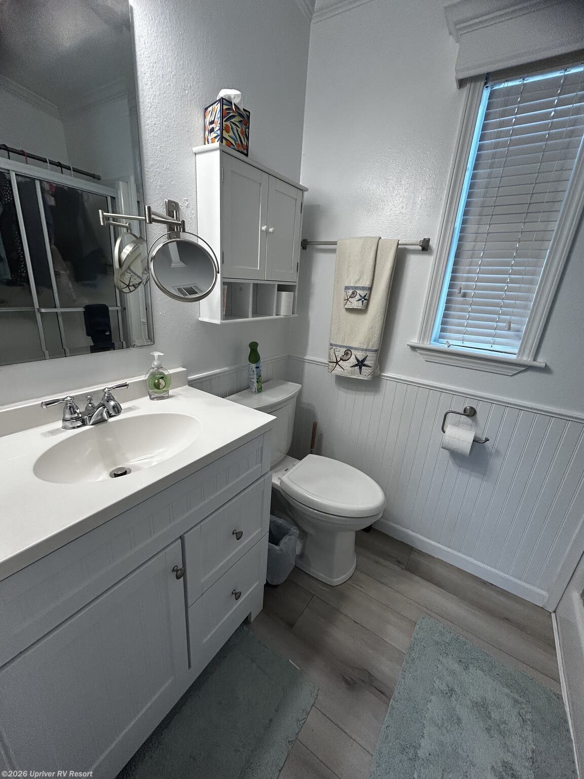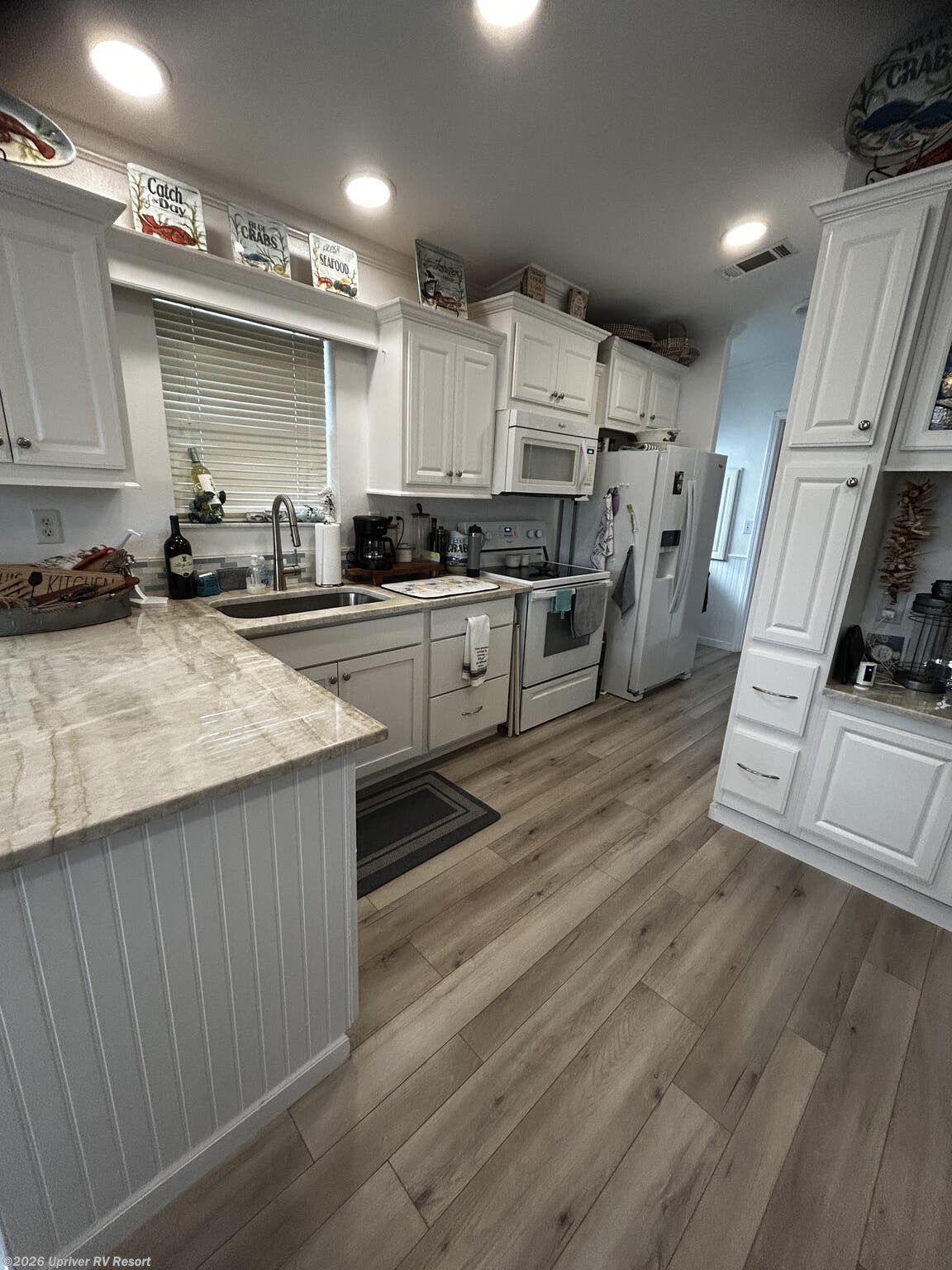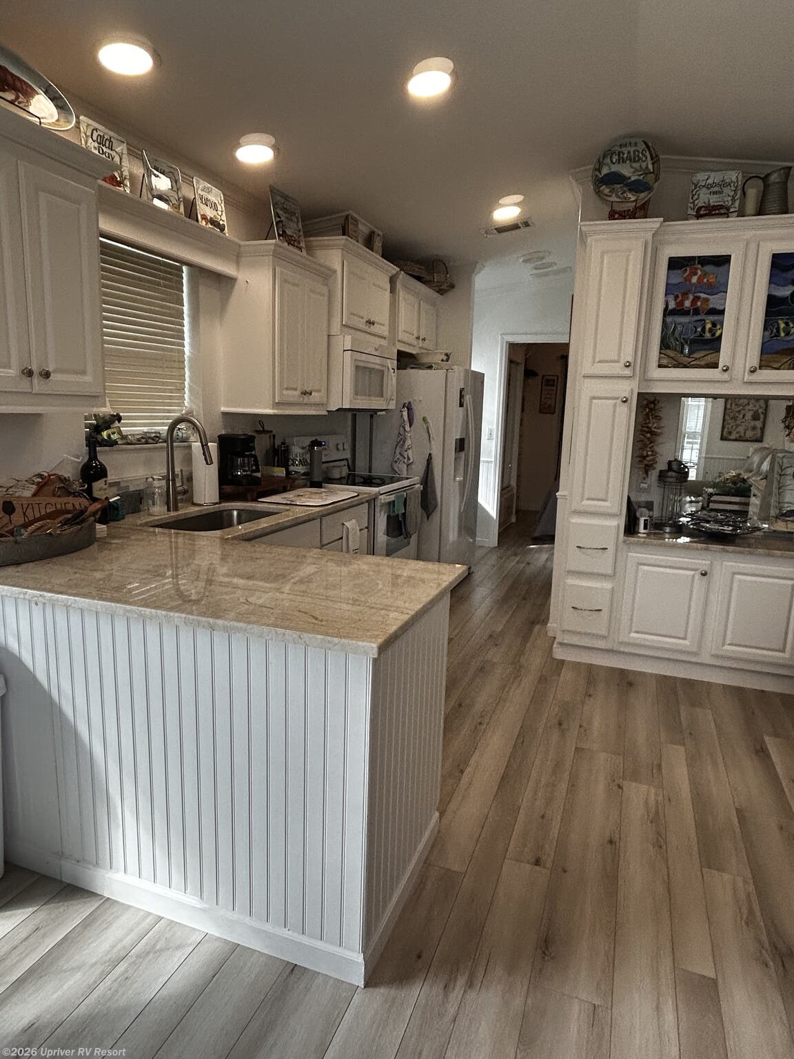 2016 Skyline Park Model on the West Drive. This unit sits on full concrete and has spray foam underneath. There is a fully screened in porch with composit deck over looking the canal, has a 27 foot boat dock. On the inside, it has valulted ceiling with window cornice and crown molding throughout. Quartz countertops, Whirlpool refridgerater new January 2026. There is a full size stackable washer & Dryer. The bedroom has a full size closet and 6 foot wardrobe with with shelves, drawers and hanging capacity. New barn door on bedroom. A rolling island with 2 barstools. The roof new Novemeber of 2023. Water heater replaced December 2025.