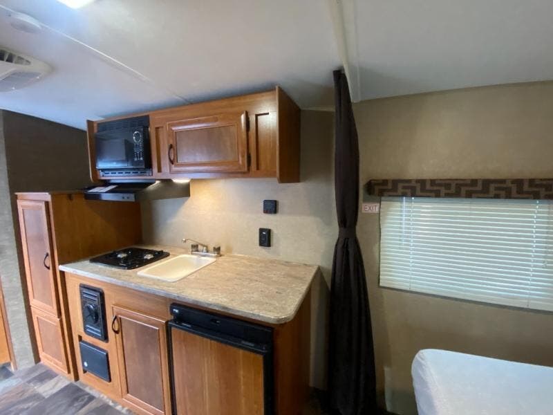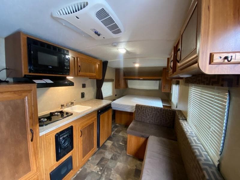 An L-sofa with dining table and overhead cabinet can be found to your right when you enter, and features plenty of seating for mealtime and more. Straight across from the sofa you will find a two burner cook-top with microwave oven overhead, a single sink and counter space, plus storage both above and below the counter.