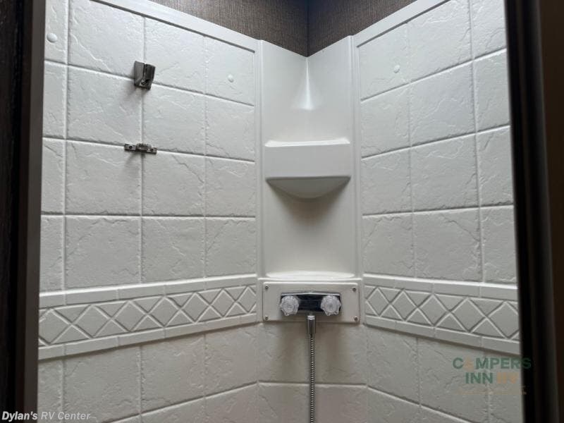 Heading toward the rear of the coach there is a full bath with angled shower, toilet and sink. The bath features dual entry doors to easily access from the living area, and from the rear bedroom too.