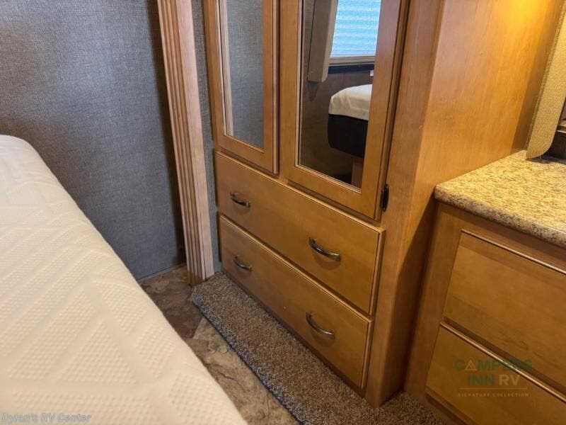 The rear bedroom features a queen bed with nightstands and overhead cabinets. There is also a closet and dresser along the full wall slide. Above the dresser you can choose to have an optional 32" LED TV.