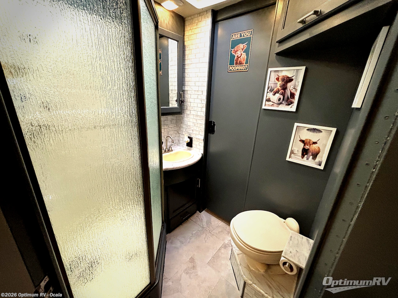 Heading toward the rear of the coach there is a full bath with angled shower, toilet and sink. The bath features dual entry doors to easily access from the living area, and from the rear bedroom too.