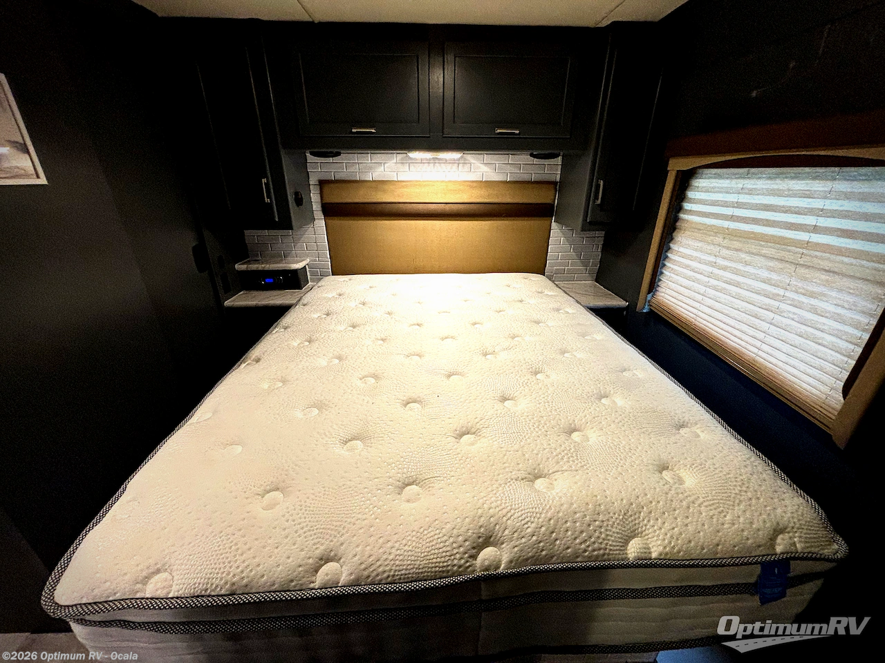 The rear bedroom features a queen bed with nightstands and overhead cabinets. There is also a closet and dresser along the full wall slide. Above the dresser you can choose to have an optional 32" LED TV.