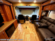 Step inside and find a front living room beyond the cab area featuring dual opposing slides. The door side slide features a sofa with 59" x 75" sleeping area as well as overhead storage. You can choose optional theater seating in place of the sofa. The opposite side features a slide with an electric fireplace with a remote and a 40" LED TV just above. Pocket doors separate the living space from the kitchen for added convenience when using the room for sleeping space. There is also an drop-down overhead bunk above the cab area for even more sleeping space for guests.
