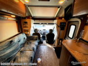 Enter in front behind the passenger seat and notice a 32" LED TV overhead. This can easily be viewed from the sofa opposite. There are two sets of seat belts for your rear travelers, and the sofa can easily be turned into a 42" x 64" sleeping space for on board campers or overnight guests. A removable pedestal table creates a nice dining space up front. Plus there is a built-in skylight over the cab area providing more natural light inside.