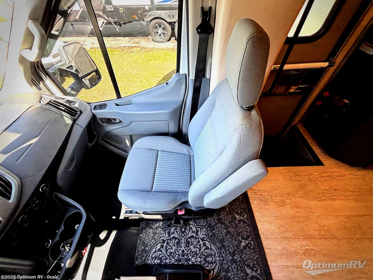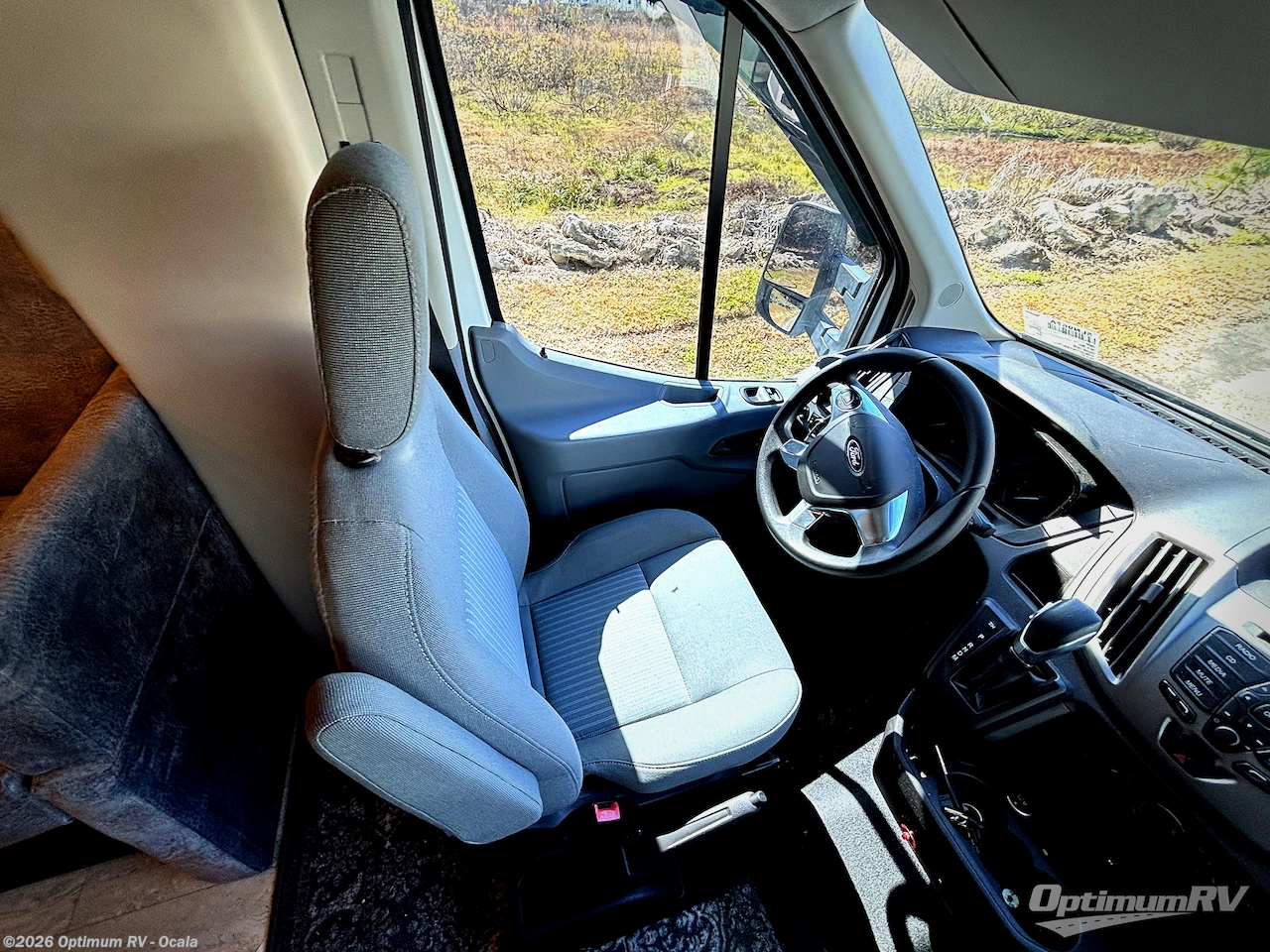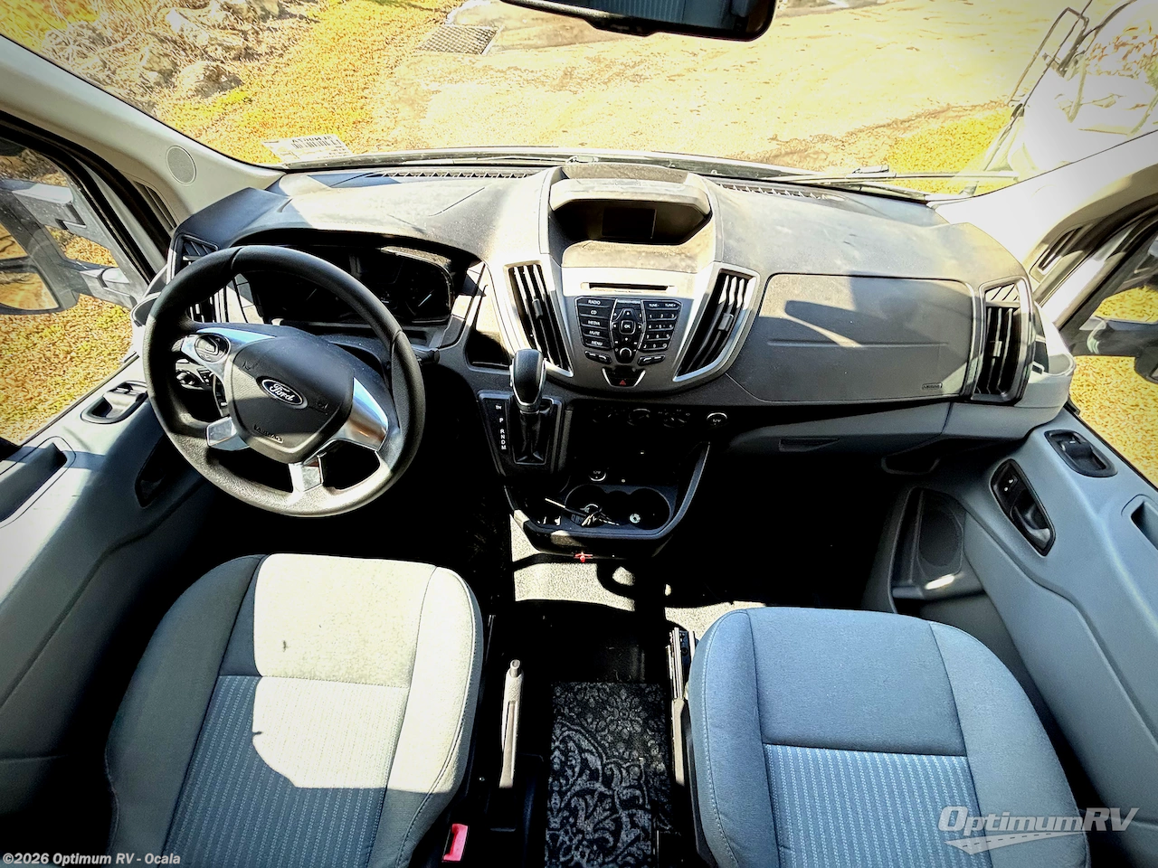 Enter in front behind the passenger seat and notice a 32" LED TV overhead. This can easily be viewed from the sofa opposite. There are two sets of seat belts for your rear travelers, and the sofa can easily be turned into a 42" x 64" sleeping space for on board campers or overnight guests. A removable pedestal table creates a nice dining space up front. Plus there is a built-in skylight over the cab area providing more natural light inside.