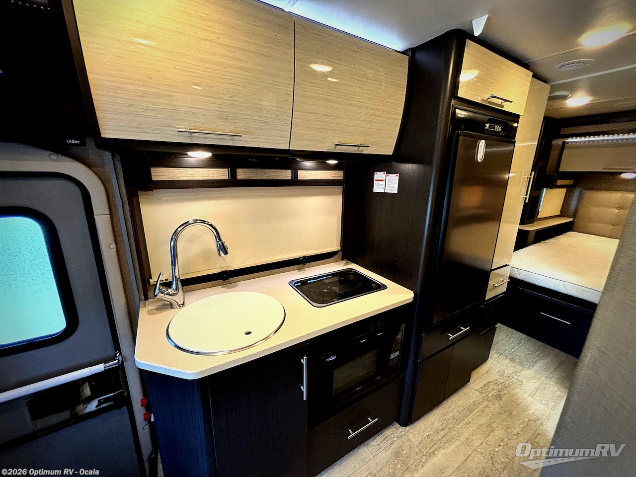 To the left of the entrance enjoy cooking and preparing light meals and snacks with a two burner cook-top, convection microwave oven, overhead cabinets, refrigerator, and round kitchen sink. There are ample overhead cabinets for stowing away your dishes and things.
