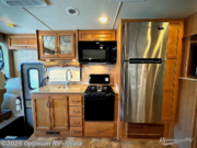 In the master bedroom you will find a slide out queen size bed with nightstands on both sides along with overhead storage above the head of the bed. Opposite find a wardrobe and dresser with an optional 32" LED TV. Across the rear wall there are pull-out shelves, a wardrobe that has been prepped for a washer/dryer, and a half bath mentioned above with a toilet, vanity with sink, plus overhead cabinet.