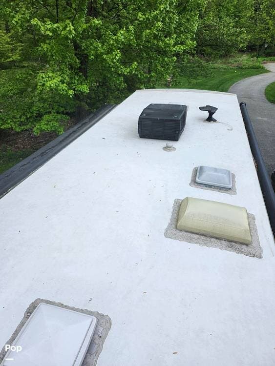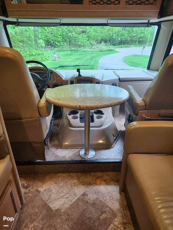 This RV has auto leveling, backup and side view cameras, a stereo, and an in-dash AC.